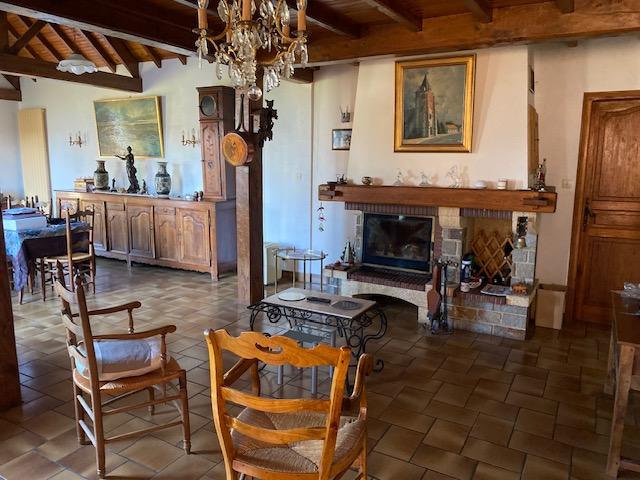 Au rez-de-chaussée : une spacieuse pièce de vie de 55 m² avec un plafond cathédrale comprenant une cheminée, une cuisine ouverte aménagée et équipée, suite parentale, salle de bain attenante, une deuxième chambre, un WC, un placard, une cave et un cellier.