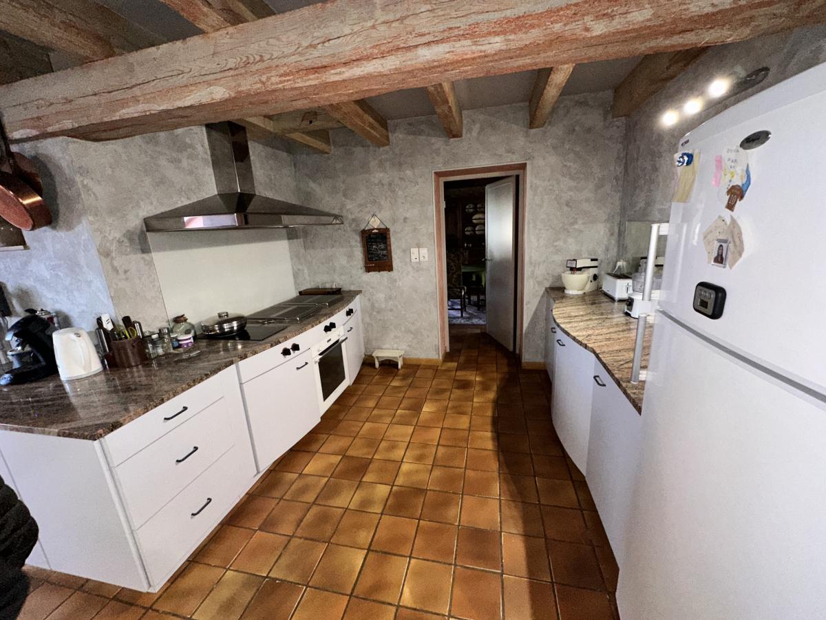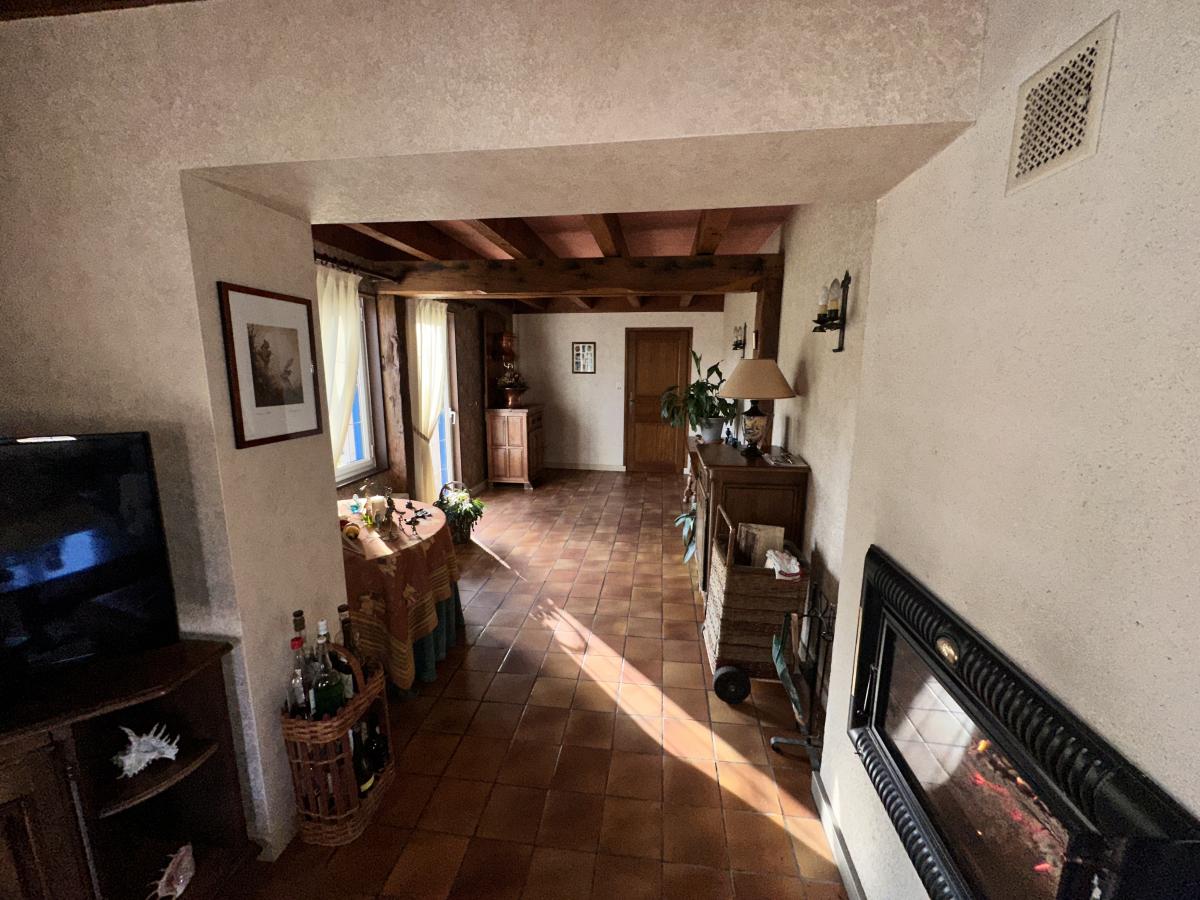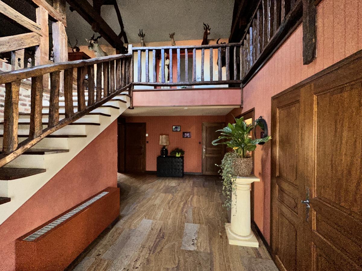 Une maison ancienne superbement rénovée associant avec harmonie le style ancien avec le contemporain, construite sur 2 niveaux. Le rez-de-chaussée avec son hall d'accueil donne accès à un séjour avec cheminée, une salle-à-manger avec coin billard ; une cuisine avec salle-à-manger équipée d'un four à pain, un salon, un bureau avec une cheminée. Depuis la cuisine, on accède à une buanderie, une cave, un débarras et aux 2 garages équipés de portes électriques. WC indépendant.