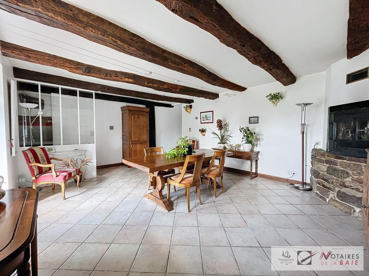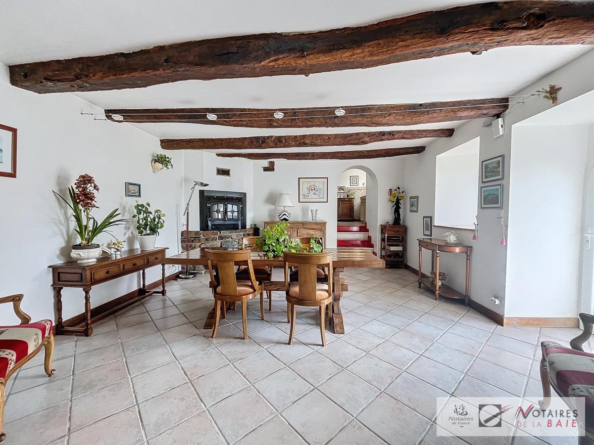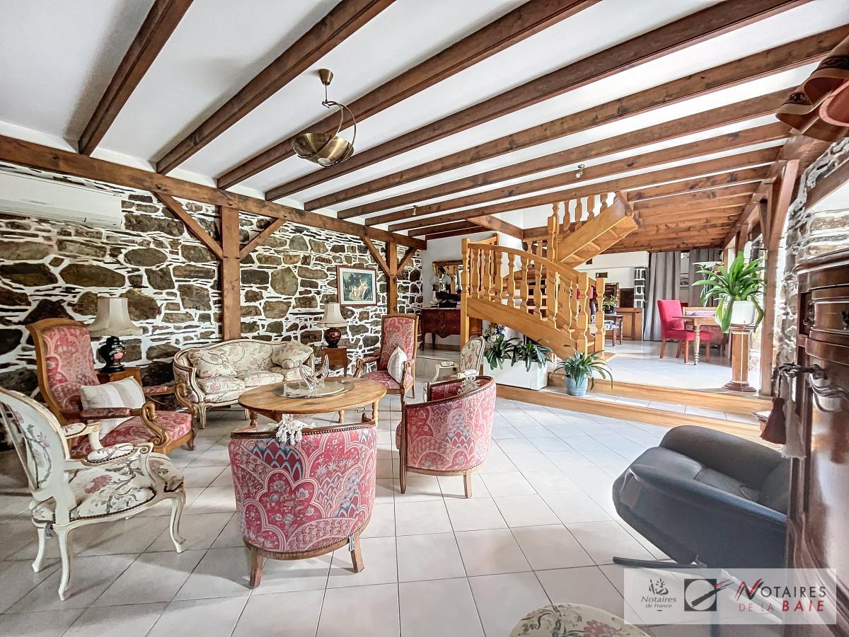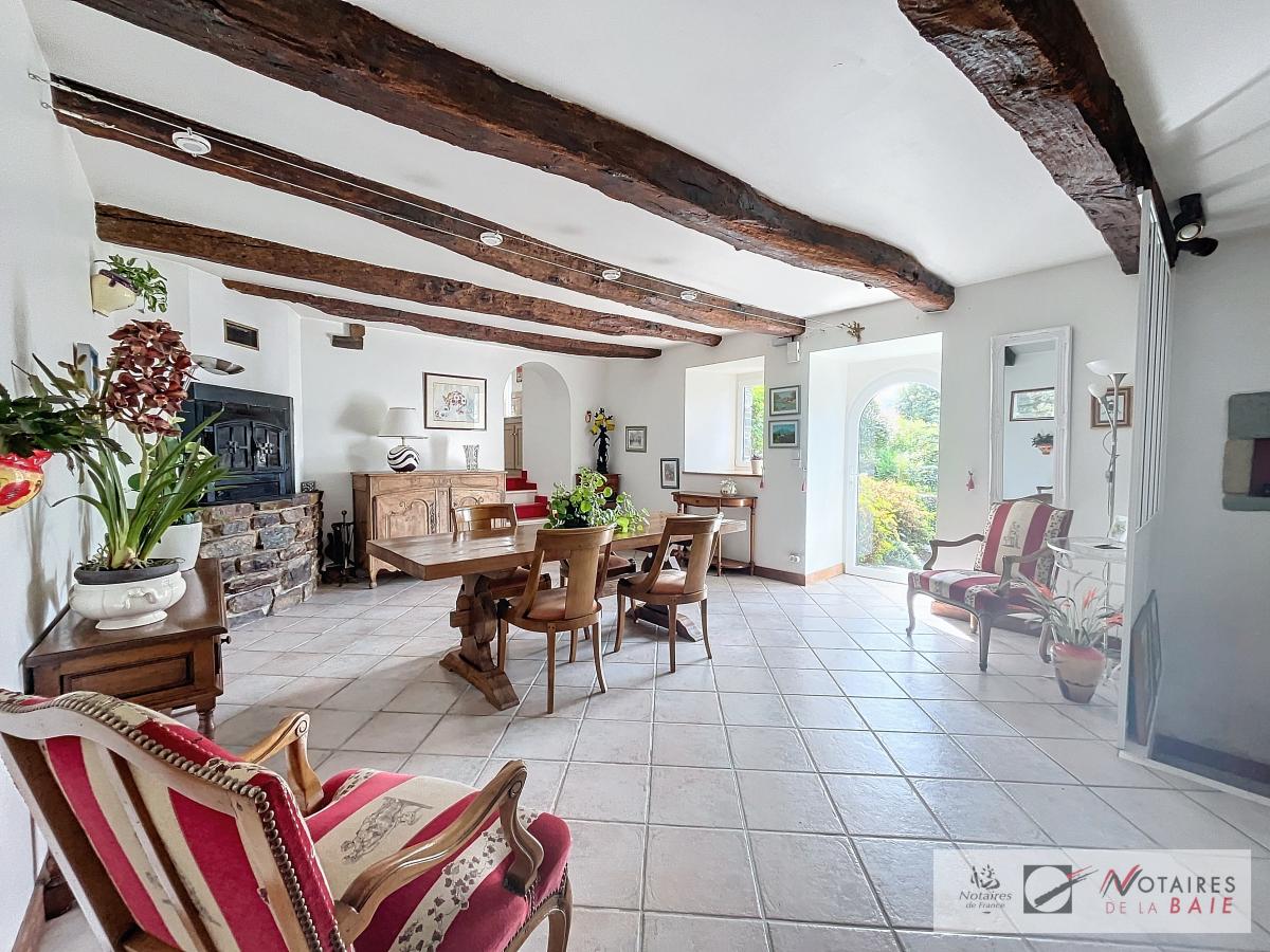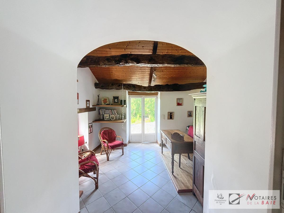 L’habitation principale une longère se compose au rez de chaussée d’une cuisine aménagée et équipée, avec arrière cuisine, un dégagement donnant accès sur le garage et sur un escalier qui mène à l’étage. Une salle à manger avec insert, 2 salons, et bureau qui donne sur une terrasse avec vue sur le parc, WC, salle d’eau.
