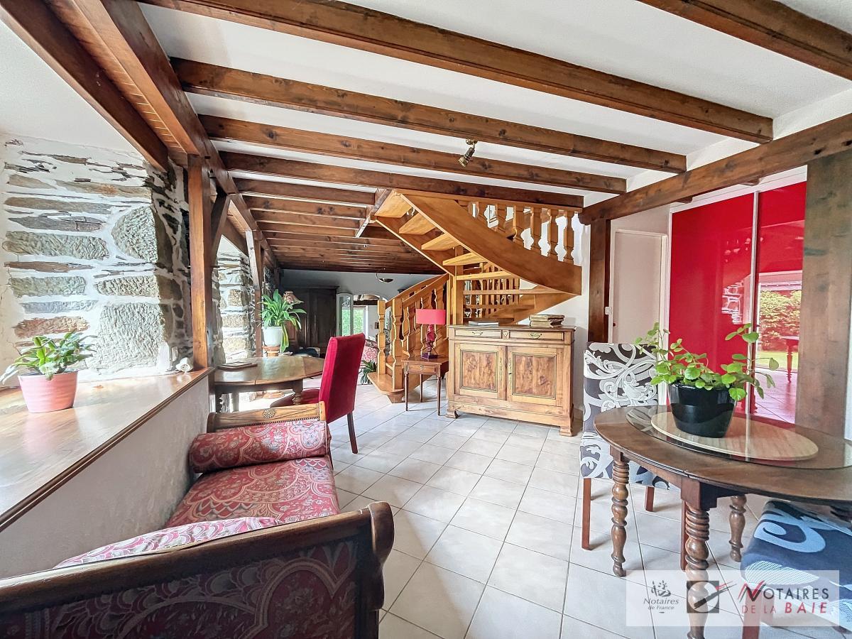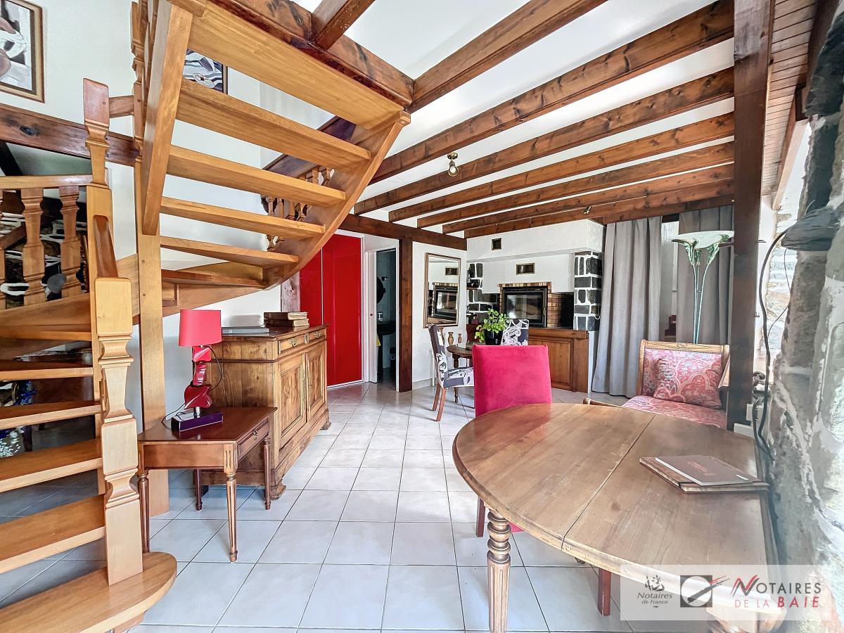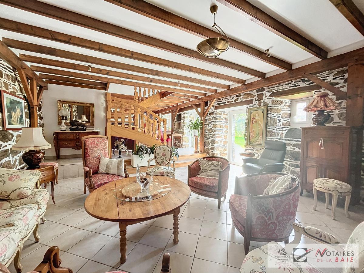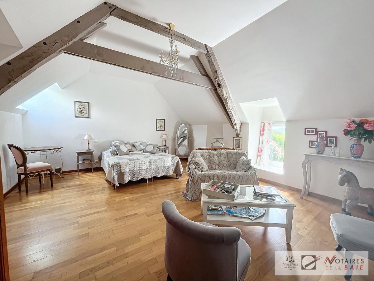 L’habitation principale une longère se compose au rez de chaussée d’une cuisine aménagée et équipée, avec arrière cuisine, un dégagement donnant accès sur le garage et sur un escalier qui mène à l’étage. Une salle à manger avec insert, 2 salons, et bureau qui donne sur une terrasse avec vue sur le parc, WC, salle d’eau.