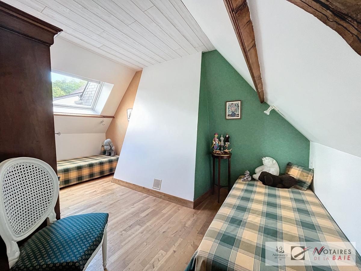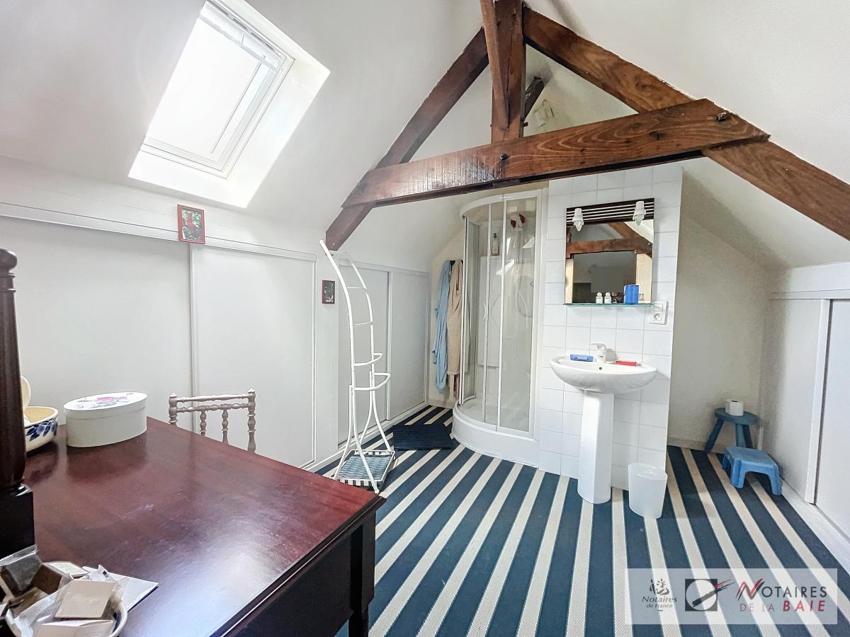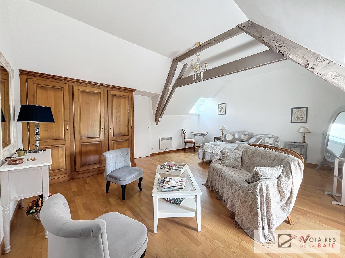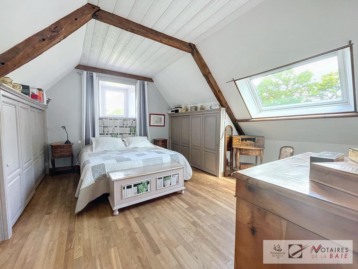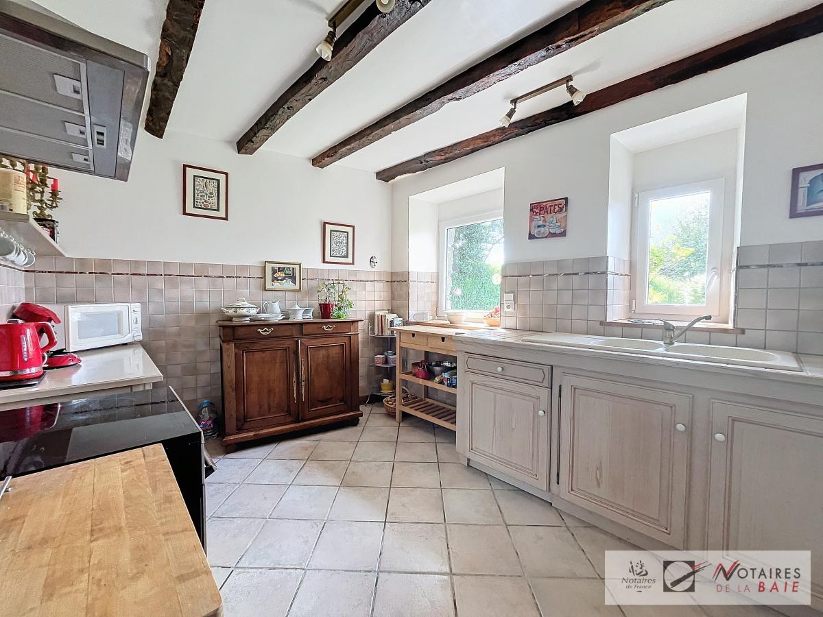 L’habitation principale une longère se compose au rez de chaussée d’une cuisine aménagée et équipée, avec arrière cuisine, un dégagement donnant accès sur le garage et sur un escalier qui mène à l’étage. Une salle à manger avec insert, 2 salons, et bureau qui donne sur une terrasse avec vue sur le parc, WC, salle d’eau.