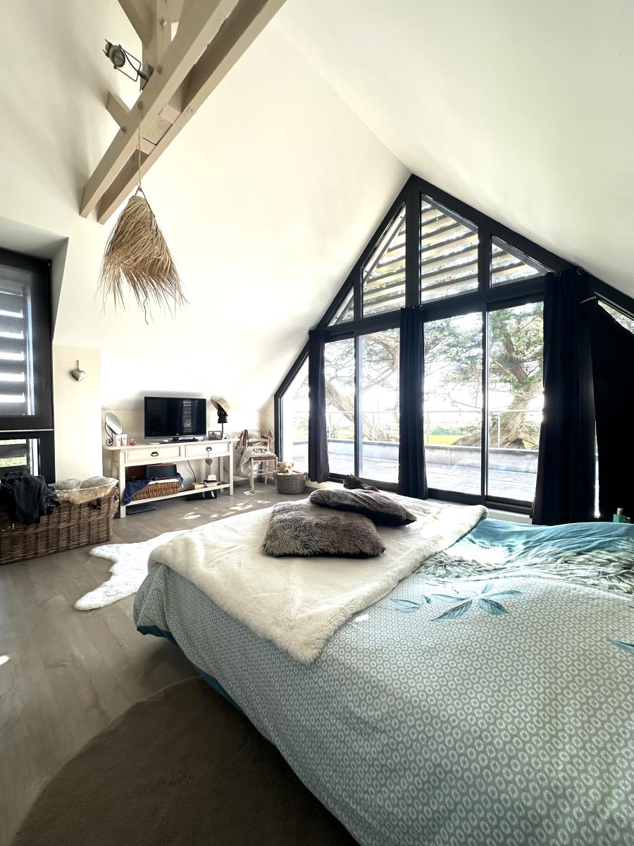 À l’étage, la suite parentale offre un véritable cocon avec sa salle de bain privative incluant baignoire et douche et terrasse vue mer.