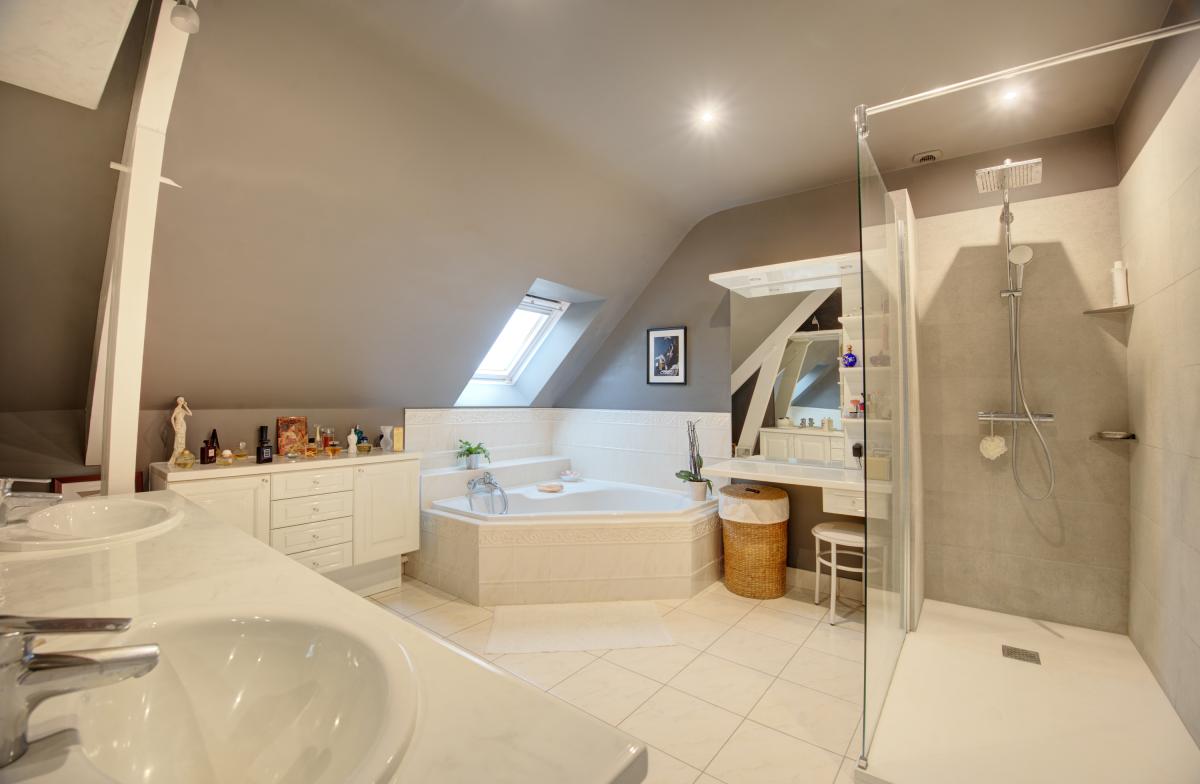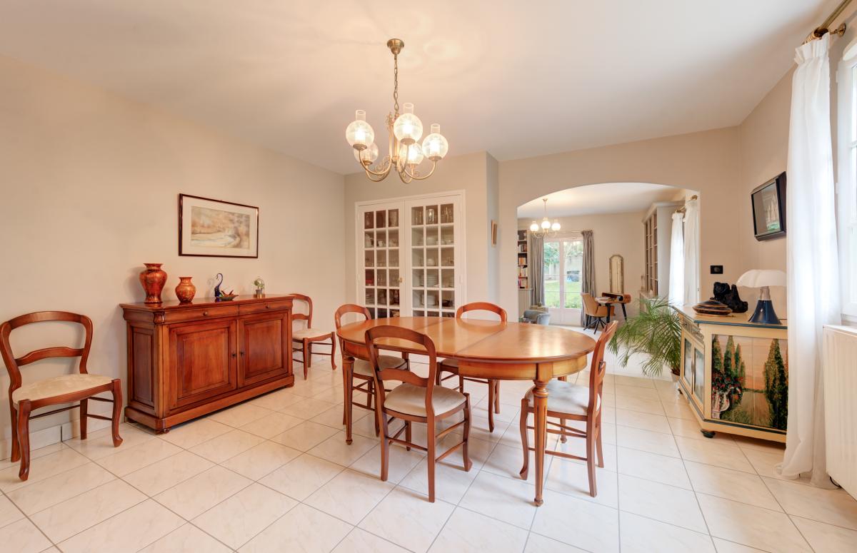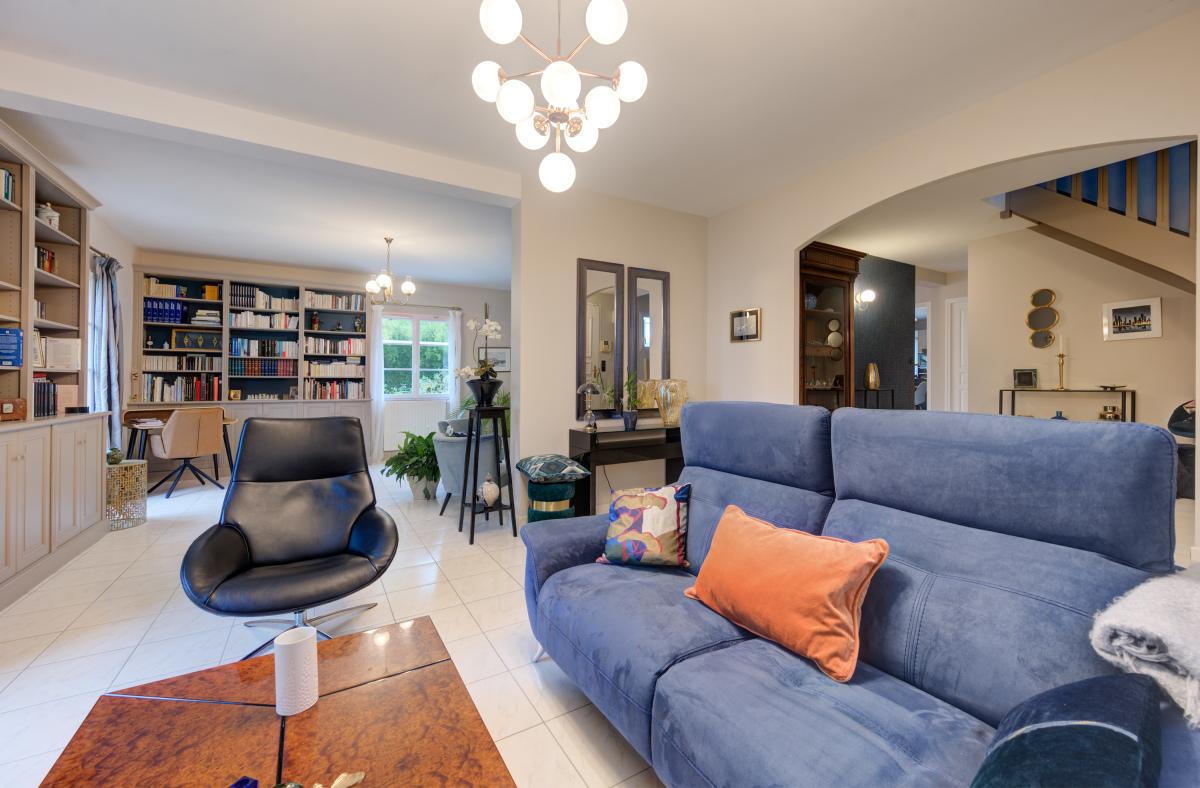 La pièce de vie, baignée de lumière grâce à sa triple exposition, se compose de deux salons aux ambiances distinctes — l’un chaleureux avec sa cheminée, l’autre plus cocooning pour vos soirées télévision et d’une salle à manger ouverte sur la cuisine.