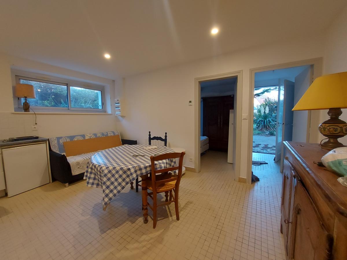 Salle salon, cuisine ouverte, chambre avec salle de bains et WC