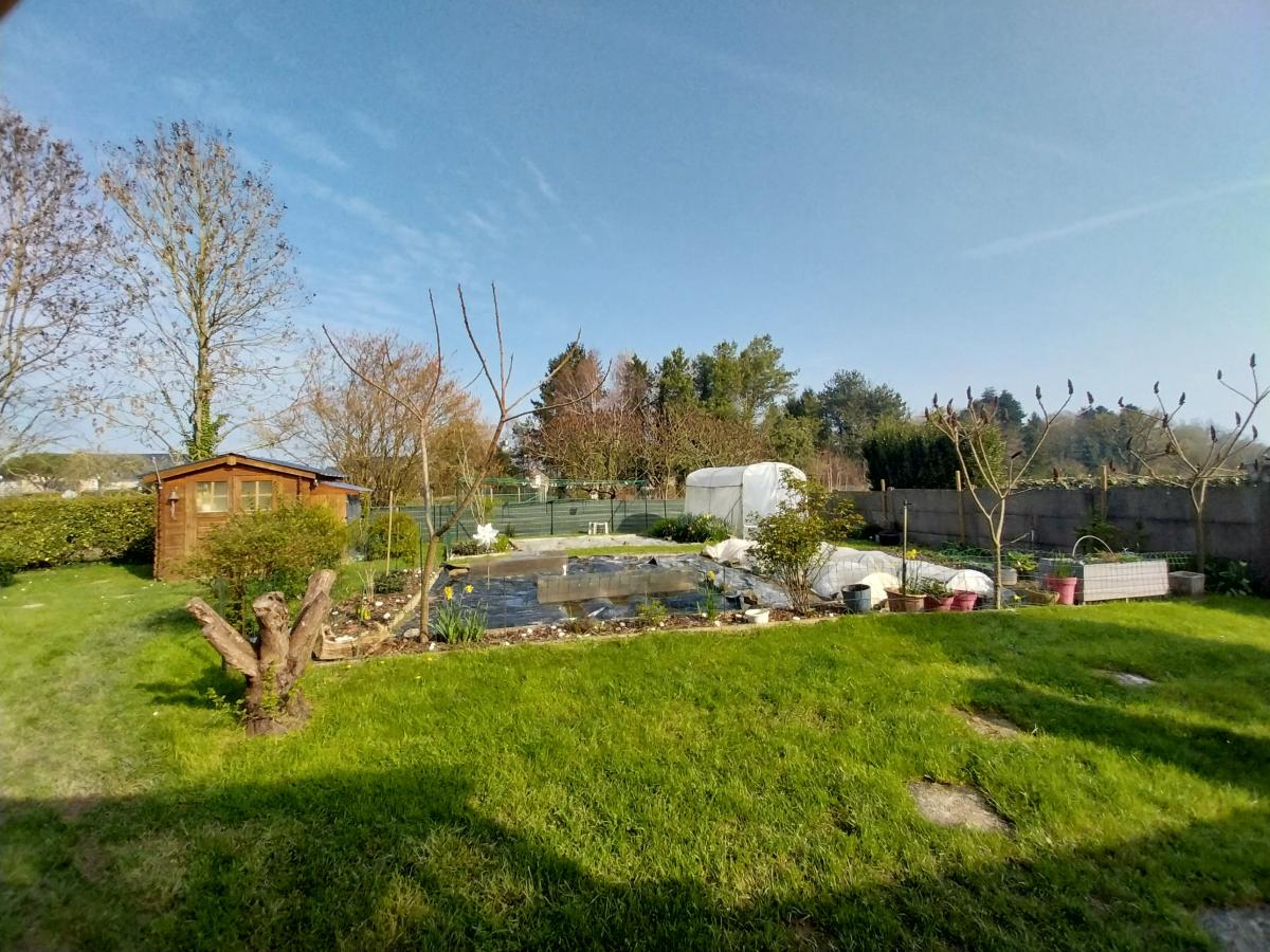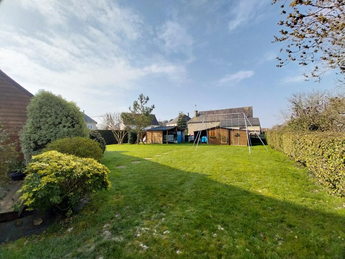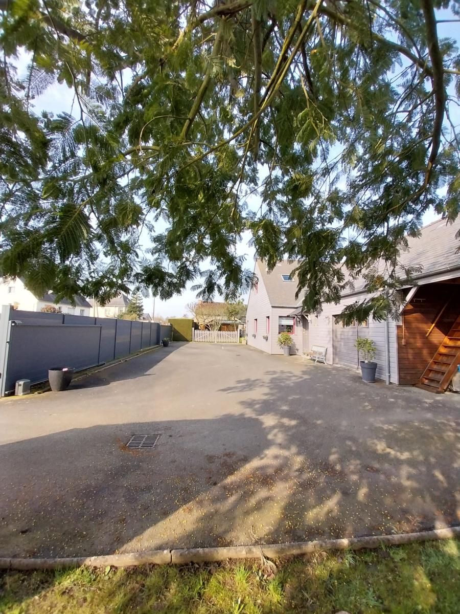 Cour goudronnée à l'avant, jardin clôturé et arboré sur l'arrière avec cabanons de jardin.