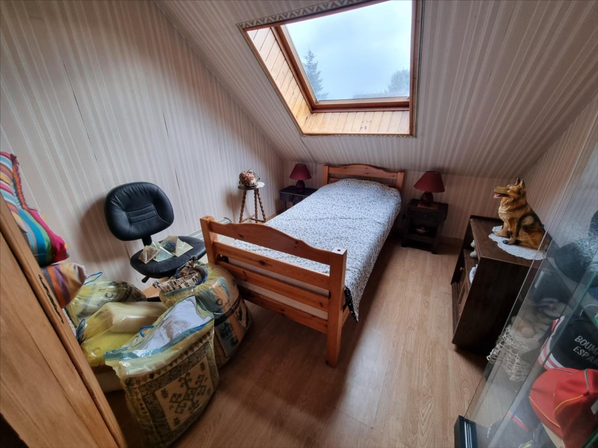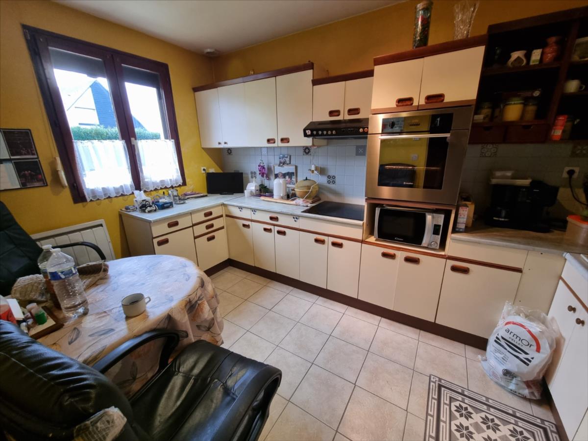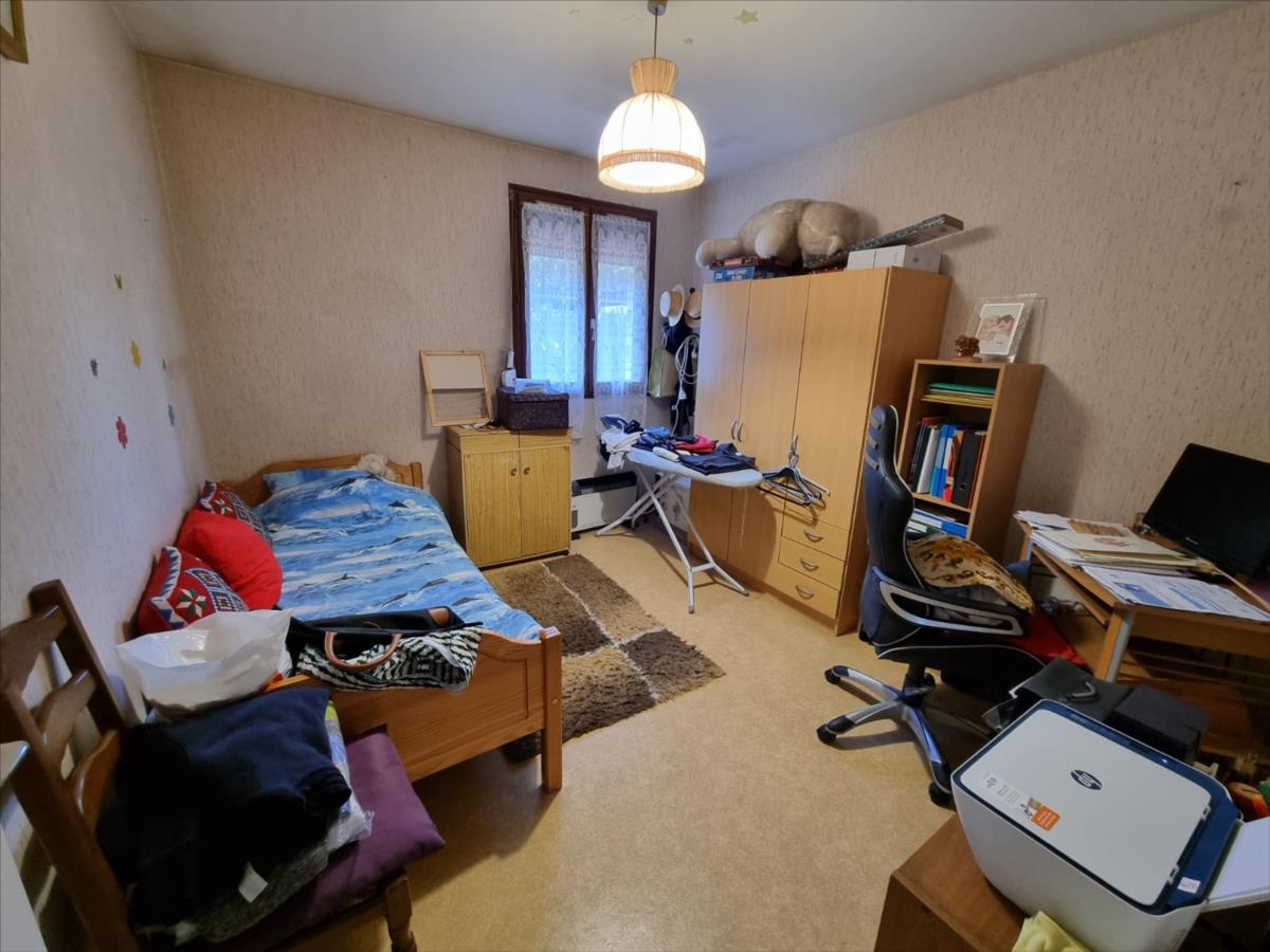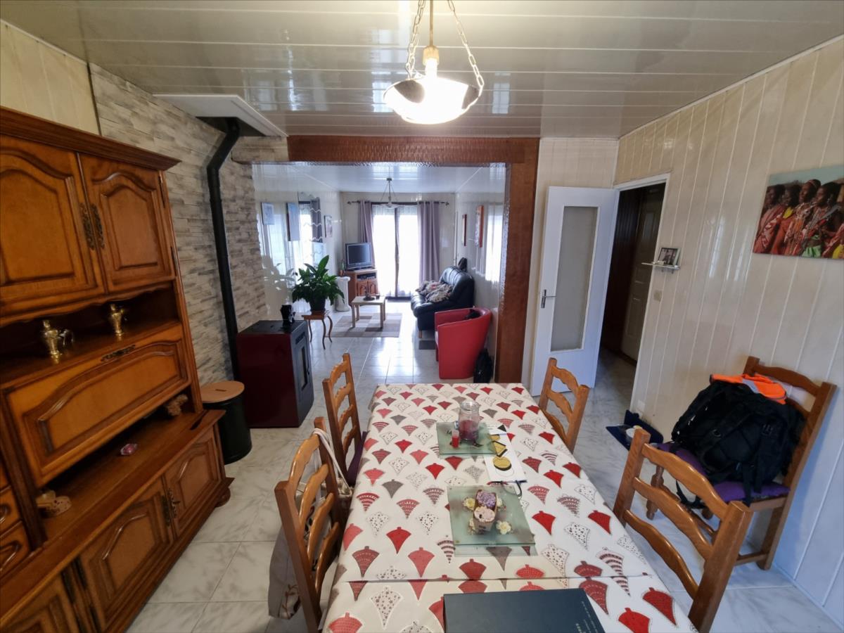 entrée séjour salon Poële à granule wc trois chambres cuisine salle d'eau.