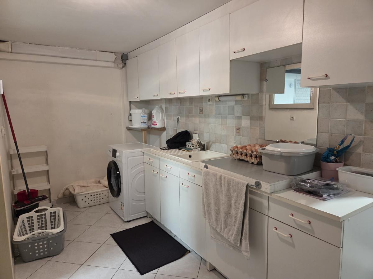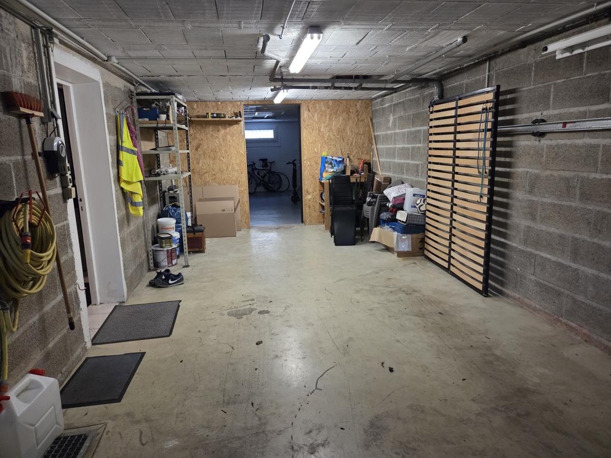 - Au sous-sol : A droite, une arrière-cuisine-buanderie, une pièce aménagée et deux caves. A gauche, un dégagement avec placard, un WC, une pièce de stockage, une pièce aménagée avec porte-fenêtre. Un grand garage divisé en deux aujourd’hui.