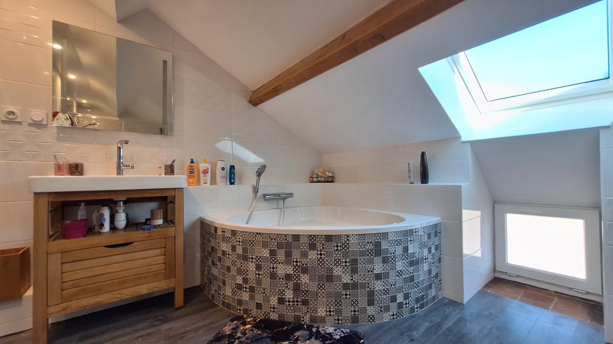 - Au rez-de-chaussée : cuisine meublée et équipée, un salon / séjour de 38 m² très lumineux, une chambre, WC indépendant, buanderie avec douche.