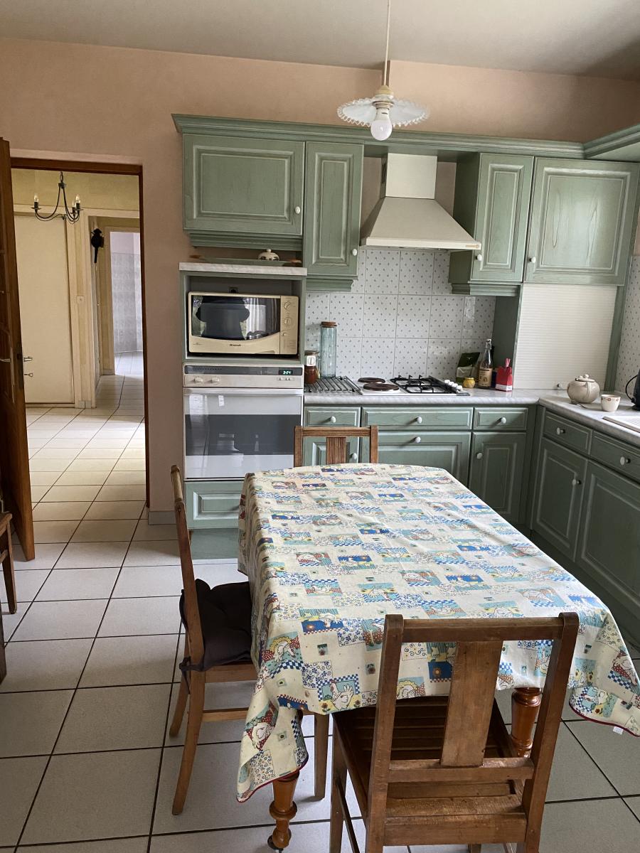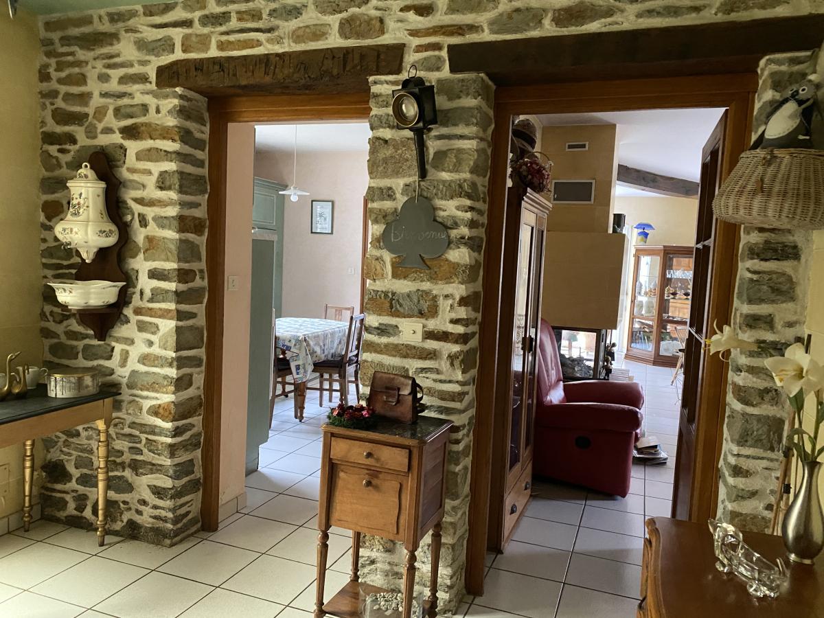 En centre bourg, très belle maison indépendante et dépendance sur 1127 m2 de terrain, en bordure de rivière, spacieuse et claire. Elle comprend en rez de chaussée un grand hall d'entrée desservant d'un côté la cuisine meublée et équipée, séjour salle et cheminée foyer fermé, buanderie/chaufferie, et de l'autre côté, une très grande chambre, salle de bains (douche et baingnoire), wc/lave mains ; étage de trois chambres, salle de bains et wc. Véranda donnant accès à la dépendance à usage de cave/atelier et garage 2 voitures avec beau grenier au-dessus.