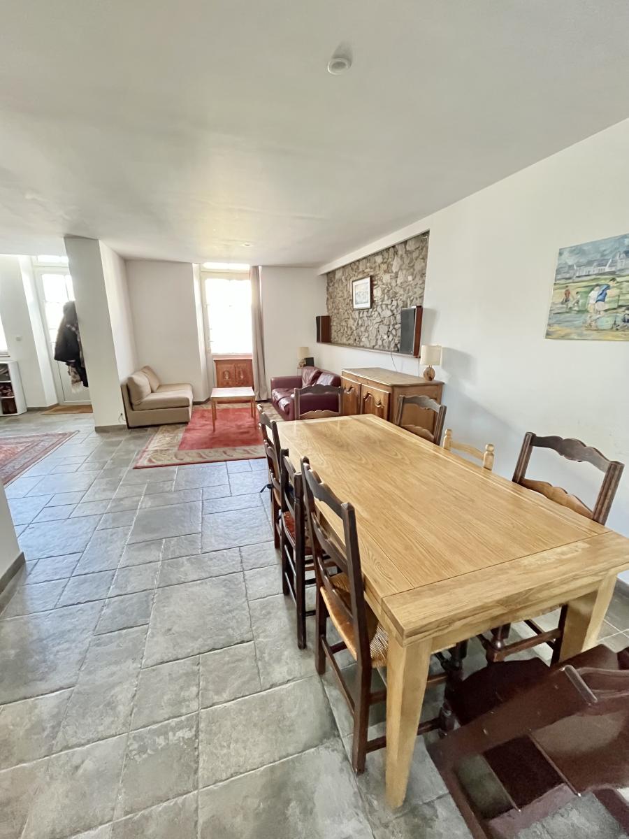 Au rez-de-chaussée, vous trouverez une pièce de vie chaleureuse avec salon et poêle à bois ouverte sur un séjour, cuisine aménagée et équipée donnant sur l'extérieur, une arrière-cuisine et un WC.
