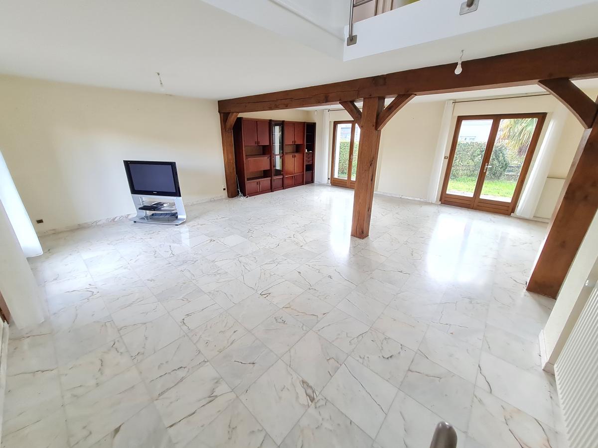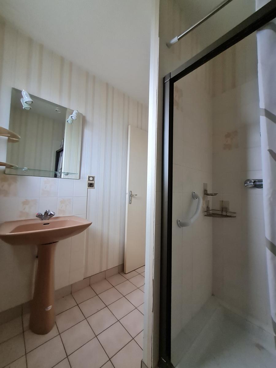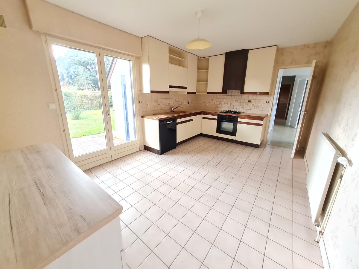 / au rdc: salon/ séjour, couloir avec placard, salle de douche (lavabo, douche), wc, chambre, cuisine aménagée et équipée (éléments hauts et bas, évier 2 bacs, four, plaque 4 feux gaz, hotte), pièce traversante, salle de douche accès PMR (wc, douche italienne, meuble vasque), deux chambres. Garage.