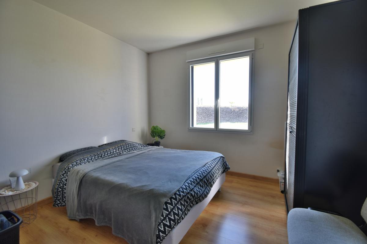 Dès l’entrée, la maison s’organise autour d’une spacieuse pièce de vie lumineuse avec plafond cathédrale et charpente apparente, offrant un volume généreux et un accès direct à la terrasse et au jardin. La cuisine, ouverte sur le séjour, est aménagée et équipée, créant un espace convivial adapté à la vie familiale.