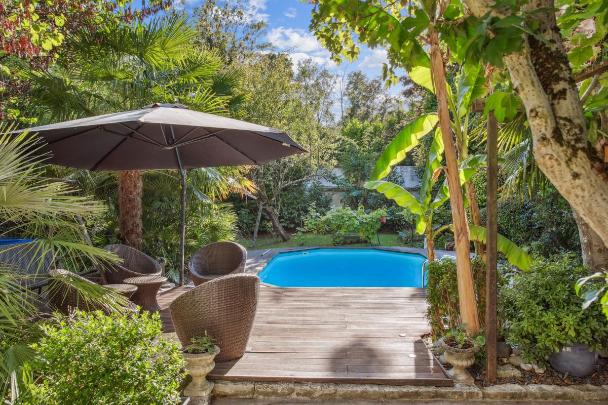À l’extérieur, le jardin paysager offre une terrasse agréable, une piscine chauffée (4x6 m), un abri de jardin et un garage.