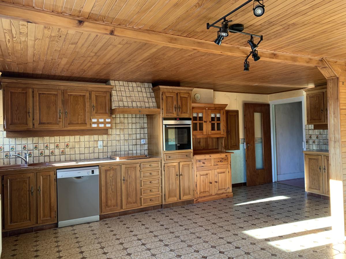 Salon avec cheminée, rangement avec placards et penderie, pièce de vie avec cuisine aménagée et équipée.