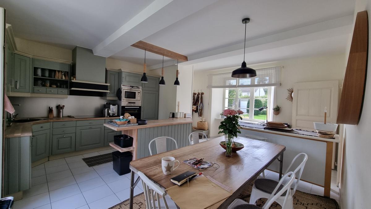 Au rez-de-chaussée : hall d'entrée, une cuisine aménagée et équipée, une grande salle à manger, un grand salon donnant sur le parc et la terrasse, wc avec lave-mains.