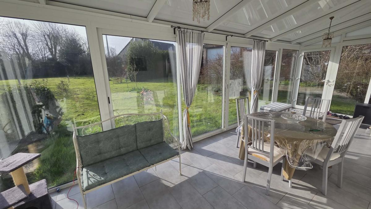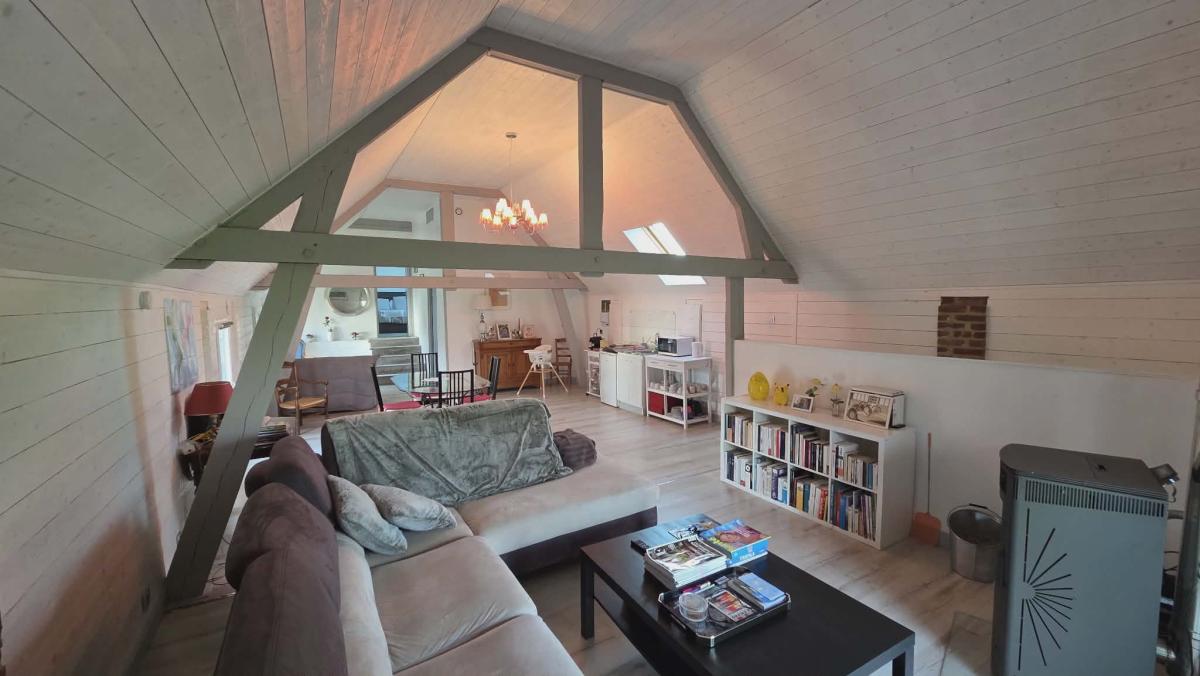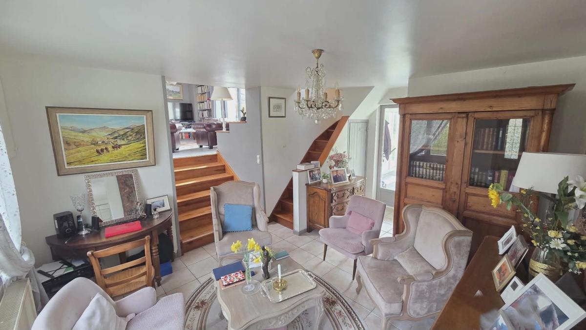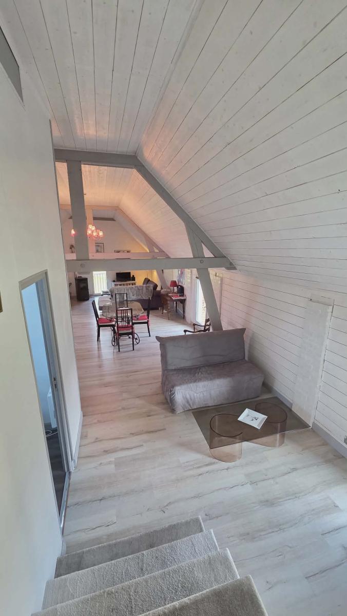 Ce bien parfaitement exposé dispose d'une véranda orientée SUD OUEST avec accès direct sur la terrasse, cuisine aménagée et équipée avec espace repas, salon et wc, grand salon avec poêle à bois et balcon.