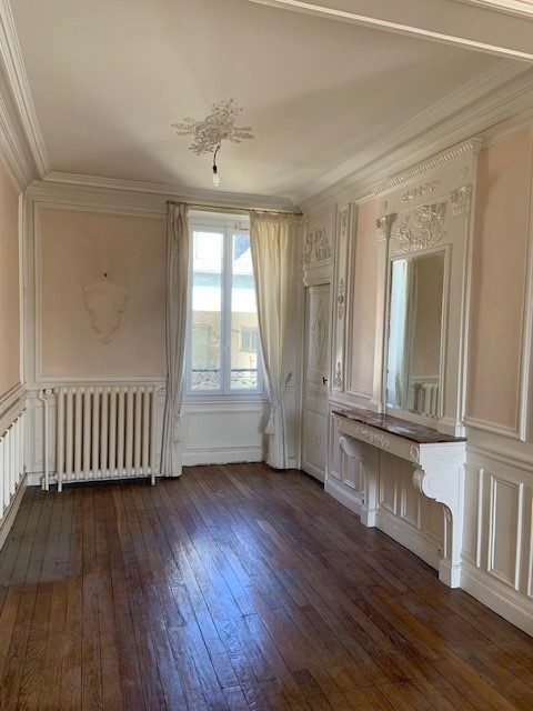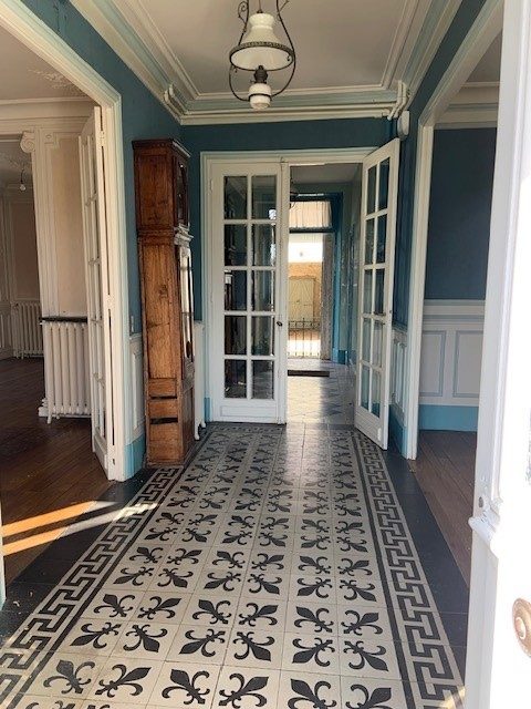 Carreaux de ciment, parquets en chêne et moulures.