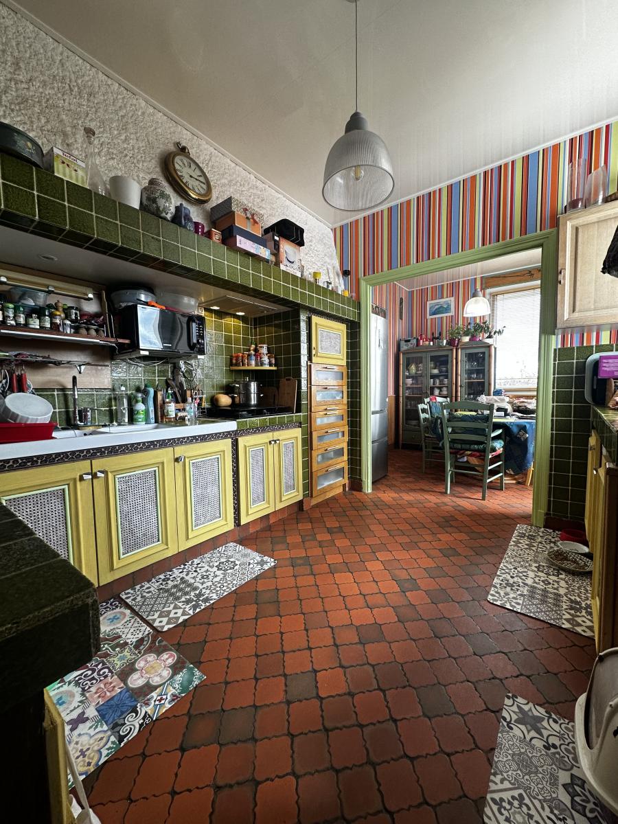 A l 'étage, un séjour-salon spacieux avec cheminée. Cuisine AE et le coin repas.