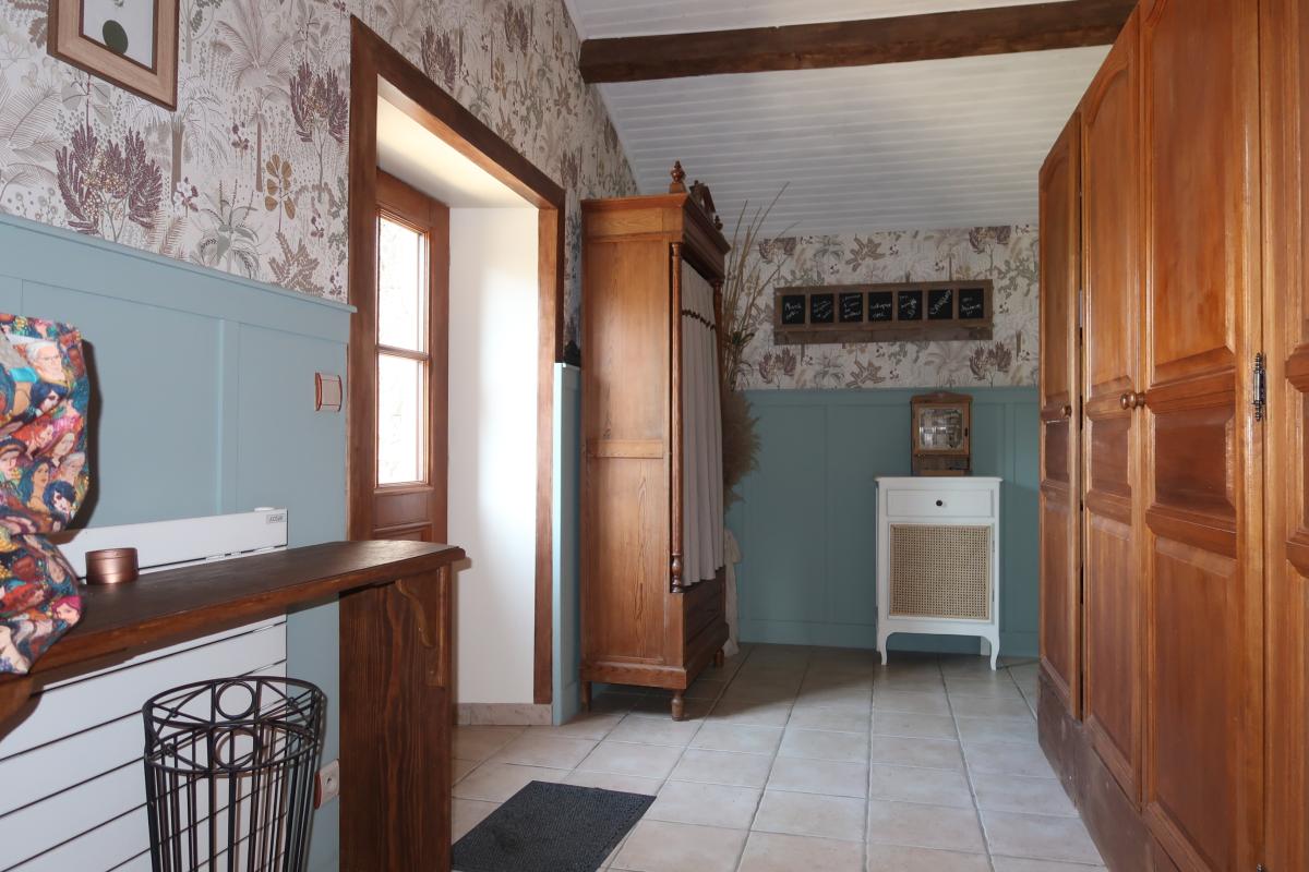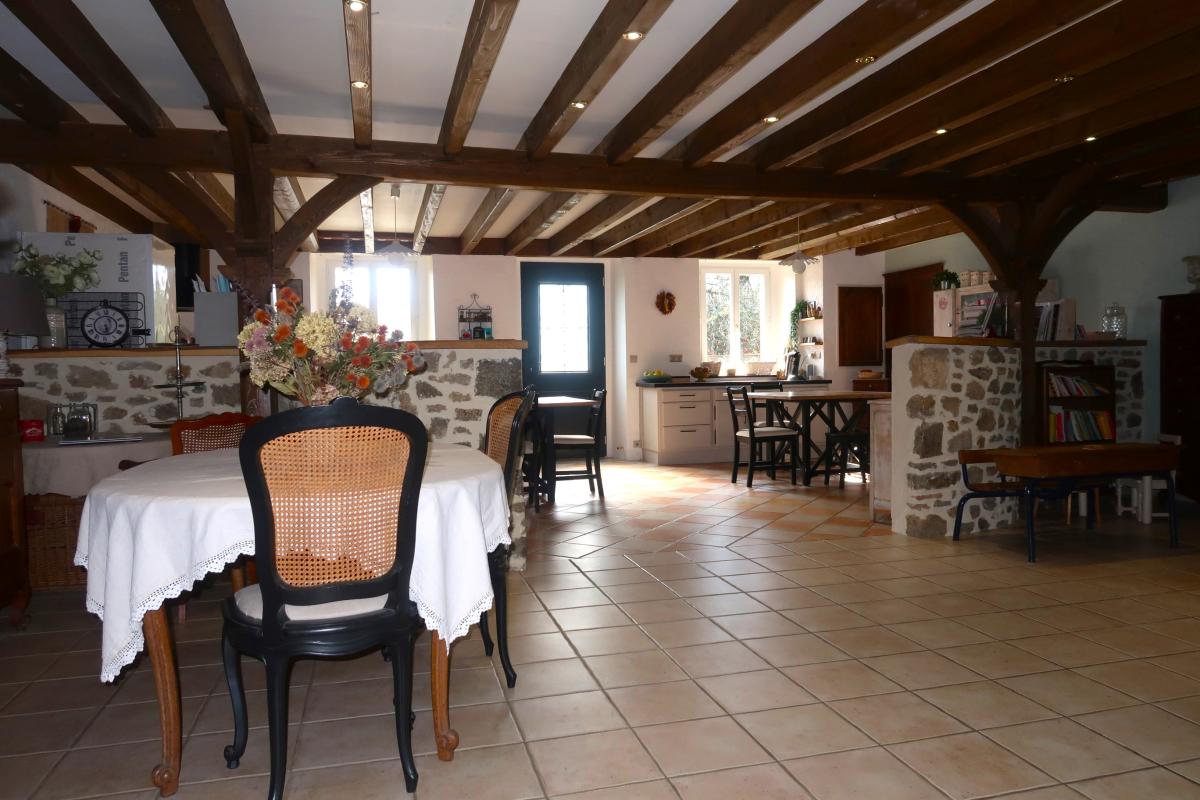 Au RDC : hall d'entrée avec rangement, vaste pièce de vie principale offrant une superficie hors normes de 113 m² composée d'une cuisine aménagée ouverte sur salon-séjour (monumentale cheminée d'époque équipée d'un poêle à bois), trois chambres de plain-pied (13,95 m²/11,9 m²/16 m²), SDB 8 m² (baignoire et douche) , WC, dégagement avec rangement, arrière-cuisine 14 m², garage/atelier 27 m², bureau 12,75 m² avec mezzanine, remise 7,8 m², ancienne écurie 55 m² comprenant un atelier, espace de stockage et une pièce semi-aménagée.