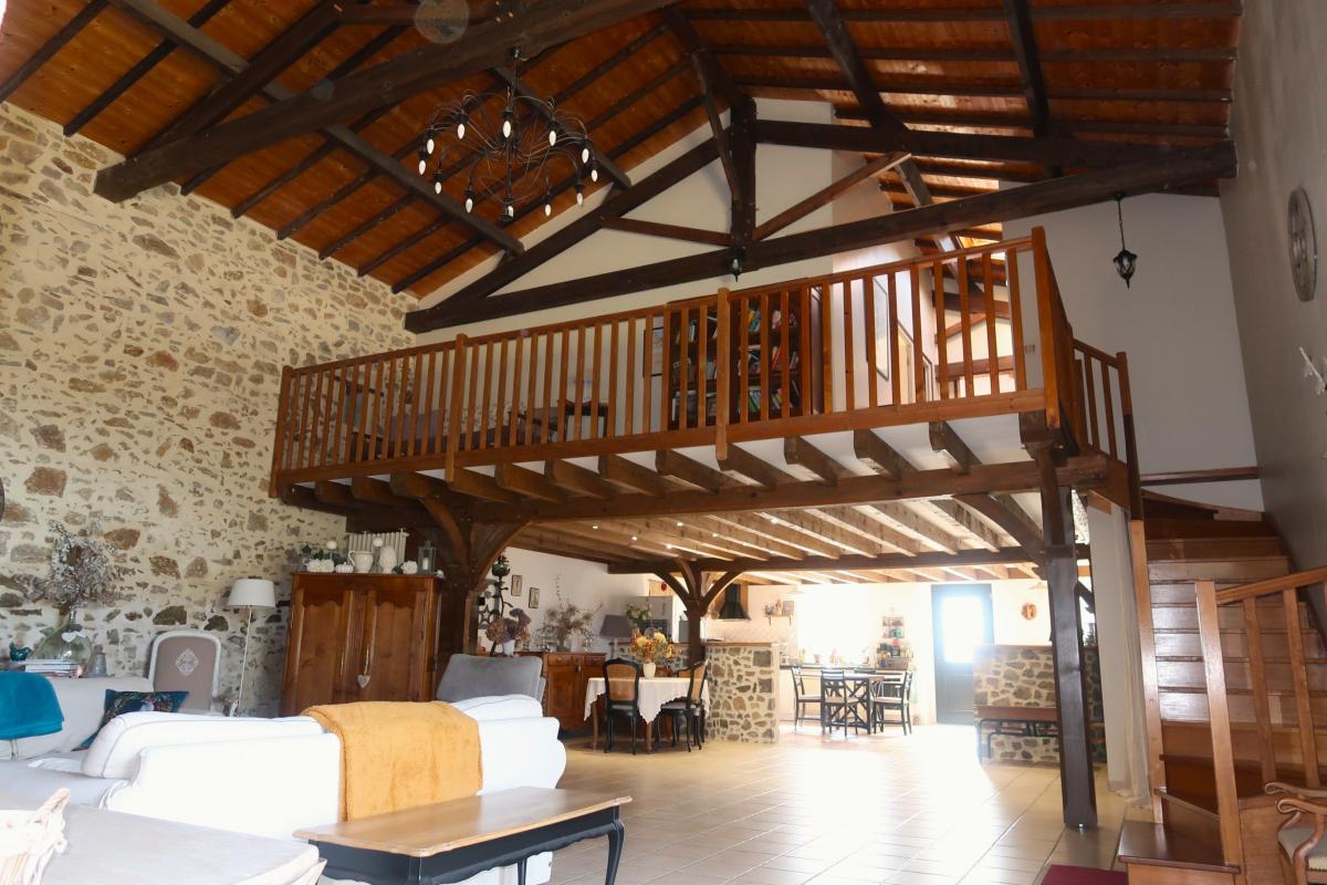 A l'étage : mezzanine de 20 m² dominant la pièce principale du RDC, trois chambres (16 m²/13 m²/11 m²), SDB, WC, rangement.