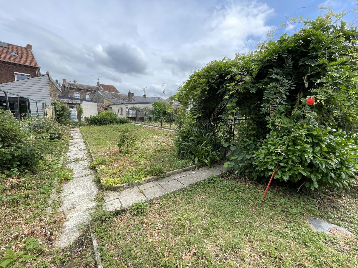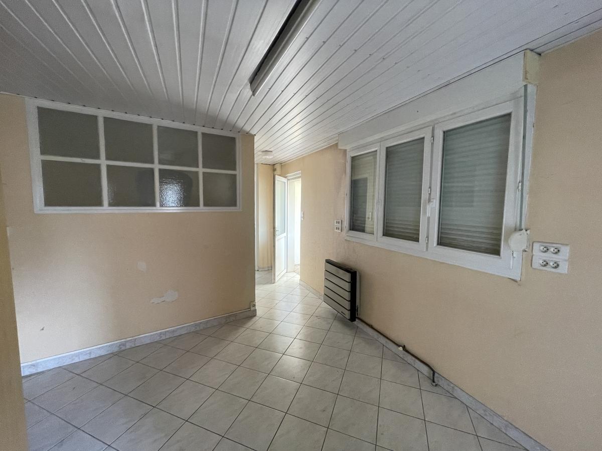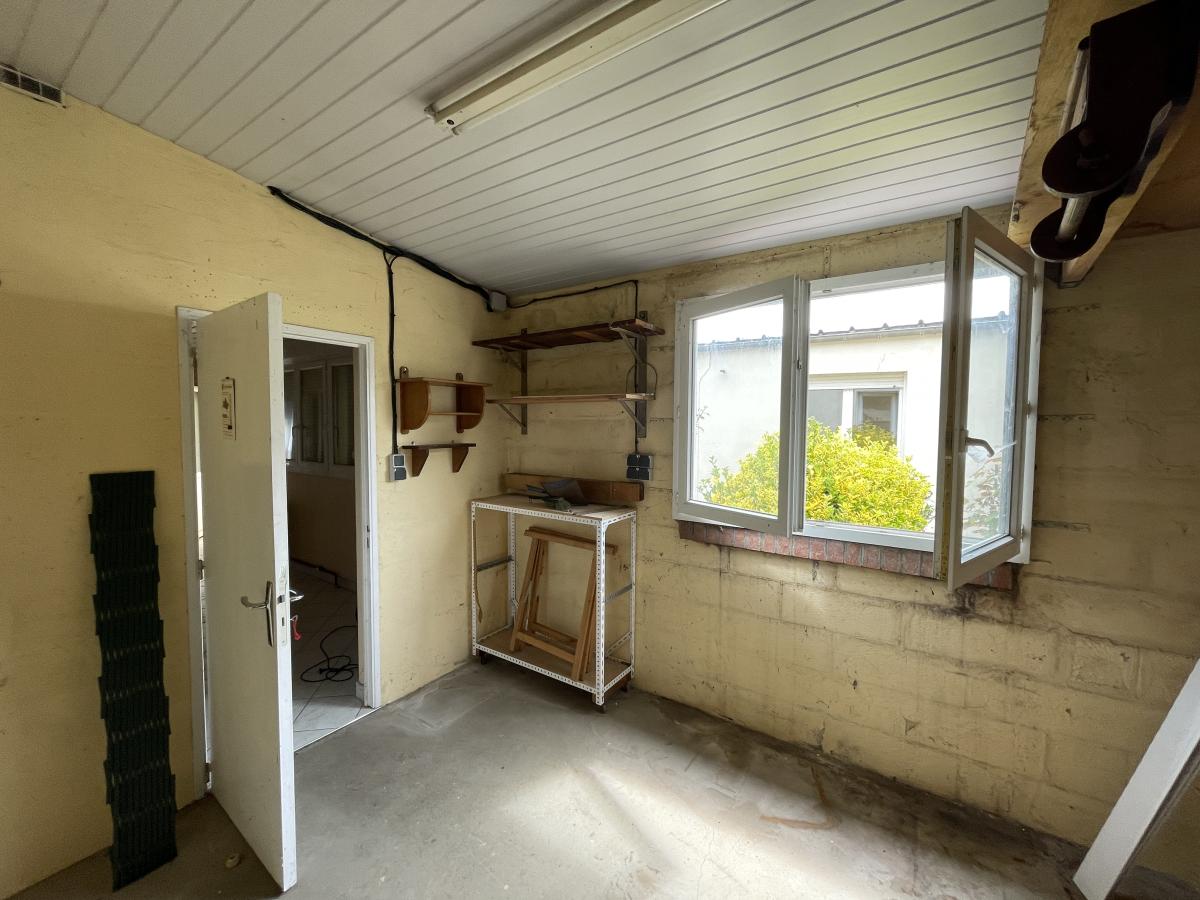 transformé en studio qui comprend une pièce ‘’séjour ou cuisine’’(Huisserie bois simple vitrage) , une chambre (huisserie pvc double vitrage) et une salle de bains avec un wc. Chauffage par convecteurs au gaz de ville, Un jardin clos et arboré d'environ 350 m². Le bien dispose d'un garage, d'une cave et d’un atelier.
