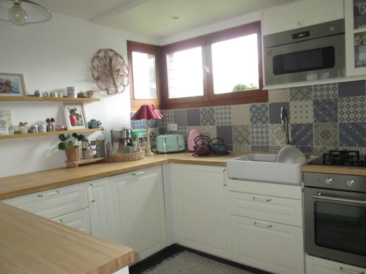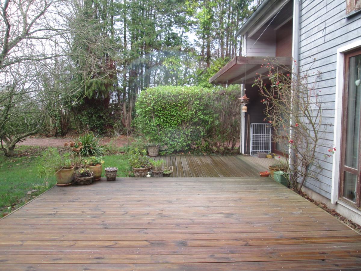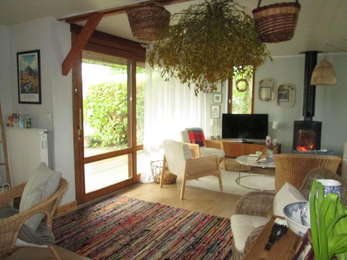 - au RDC : entrée, séjour-salon avec poêle à bois donnant sur une grande terrasse exposée Sud/Ouest, cuisine aménagée et équipée, 2ème salon avec poêle à bois, 2 chambres, salle d’eau, WC, une pièce avec placards, buanderie ;