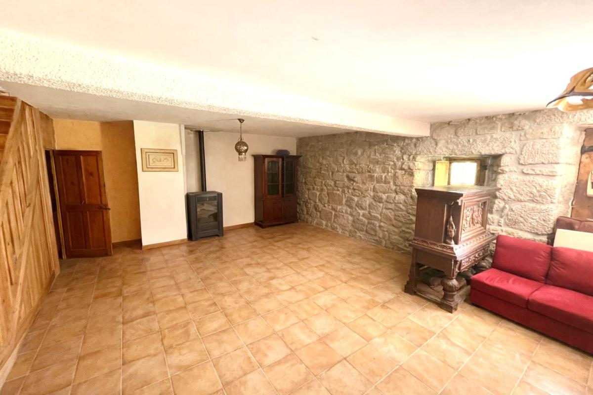 Dans le prolongement, la pièce de vie emménagée dans l'étable agrémentée par un poêle a pellet