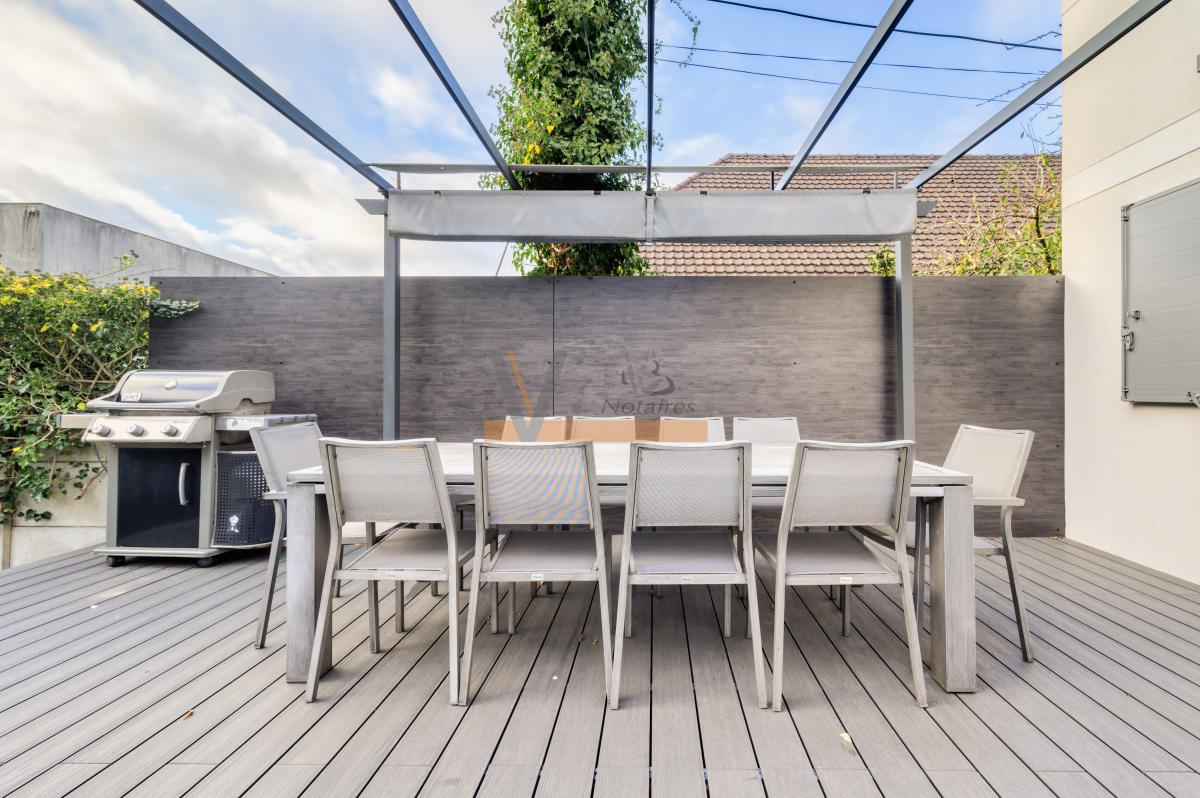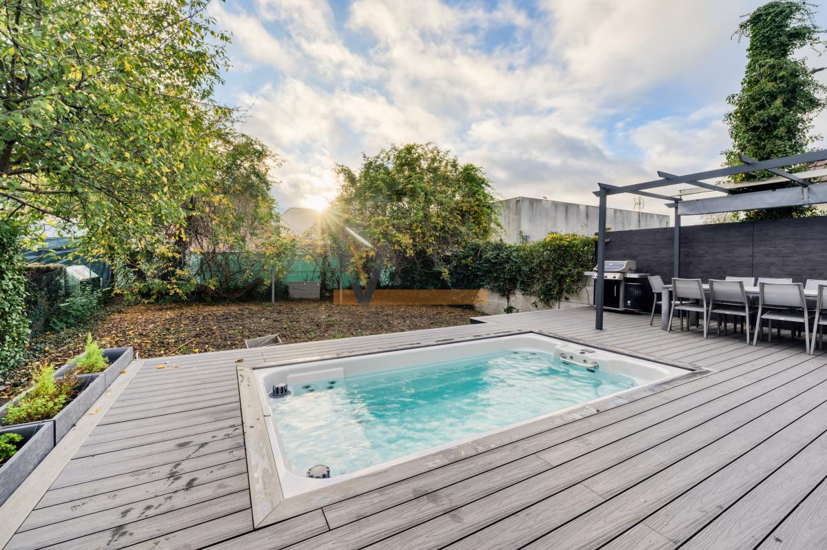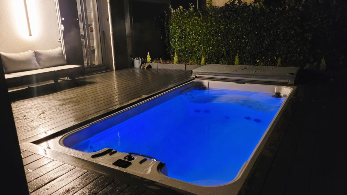 La terrasse est dotée d'une piscine/Jacuzzi, chauffée et nage à contre-courant, et d'un espace repas sous pergola avec ombrage pouvant accueillir une table pour 10 personnes environs.