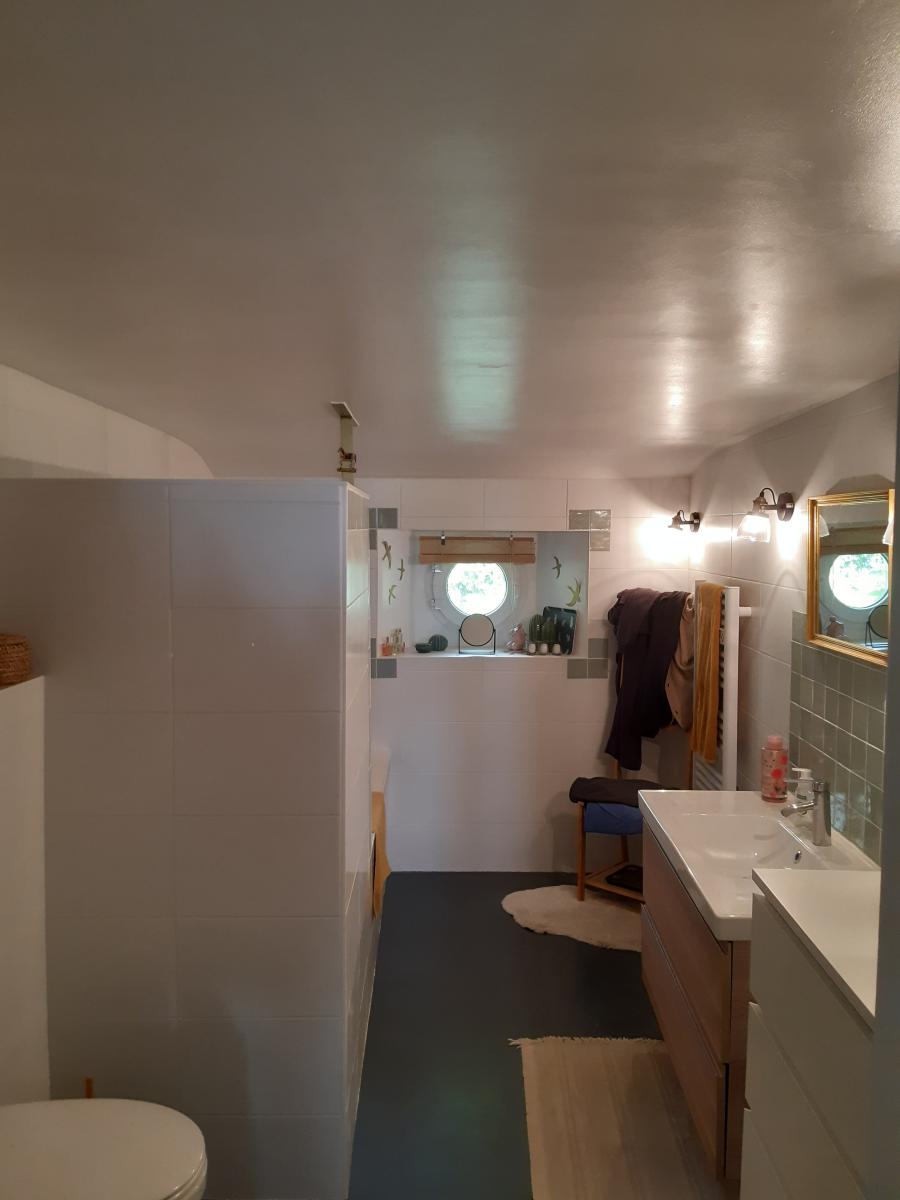 Le corps du logis comprend: séjour avec cheminée et poutres, deux grandes chambres au rez-de-chaussée, avec sanitaire, bibliothèque . A l'étage, escalier en ardoises, avec une pièce de 40 m² à aménager avec cheminée, deux chambres avec sanitaires privatifs et un bureau.