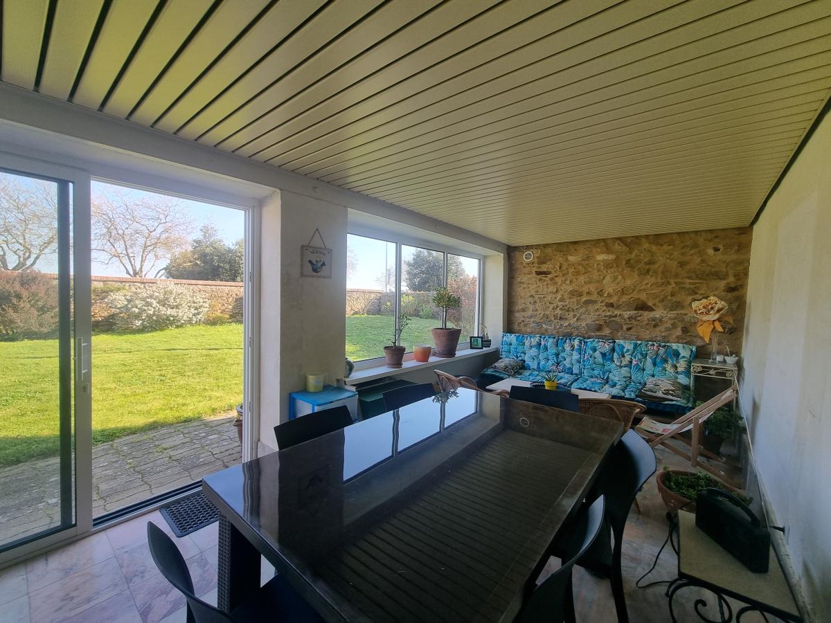 À l’extérieur, le terrain offre un cadre paisible et préservé et d'une terrasse en hauteur, idéal pour profiter de la vue mer.