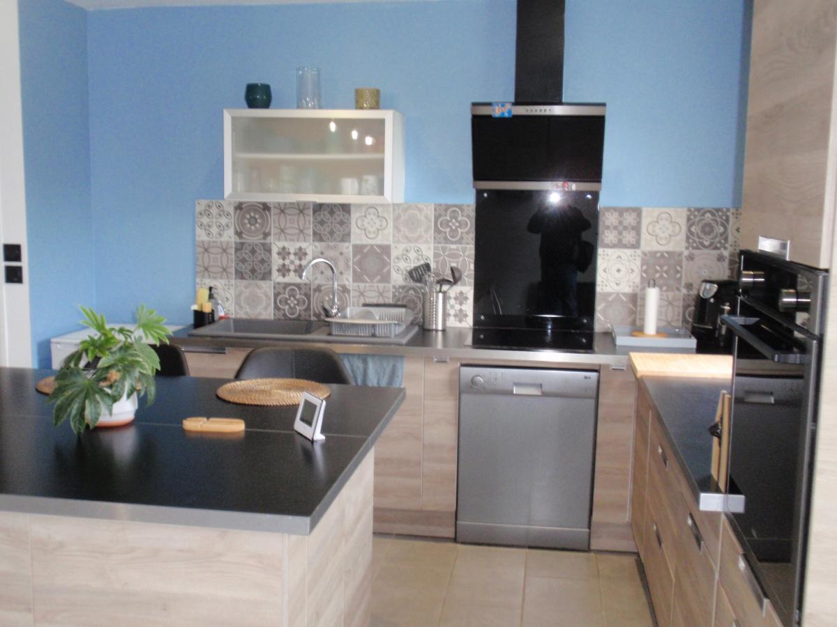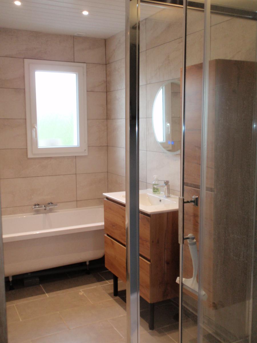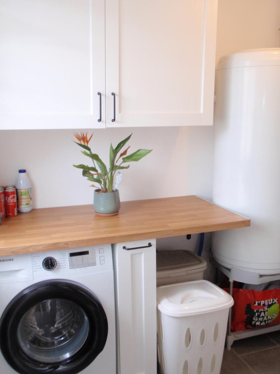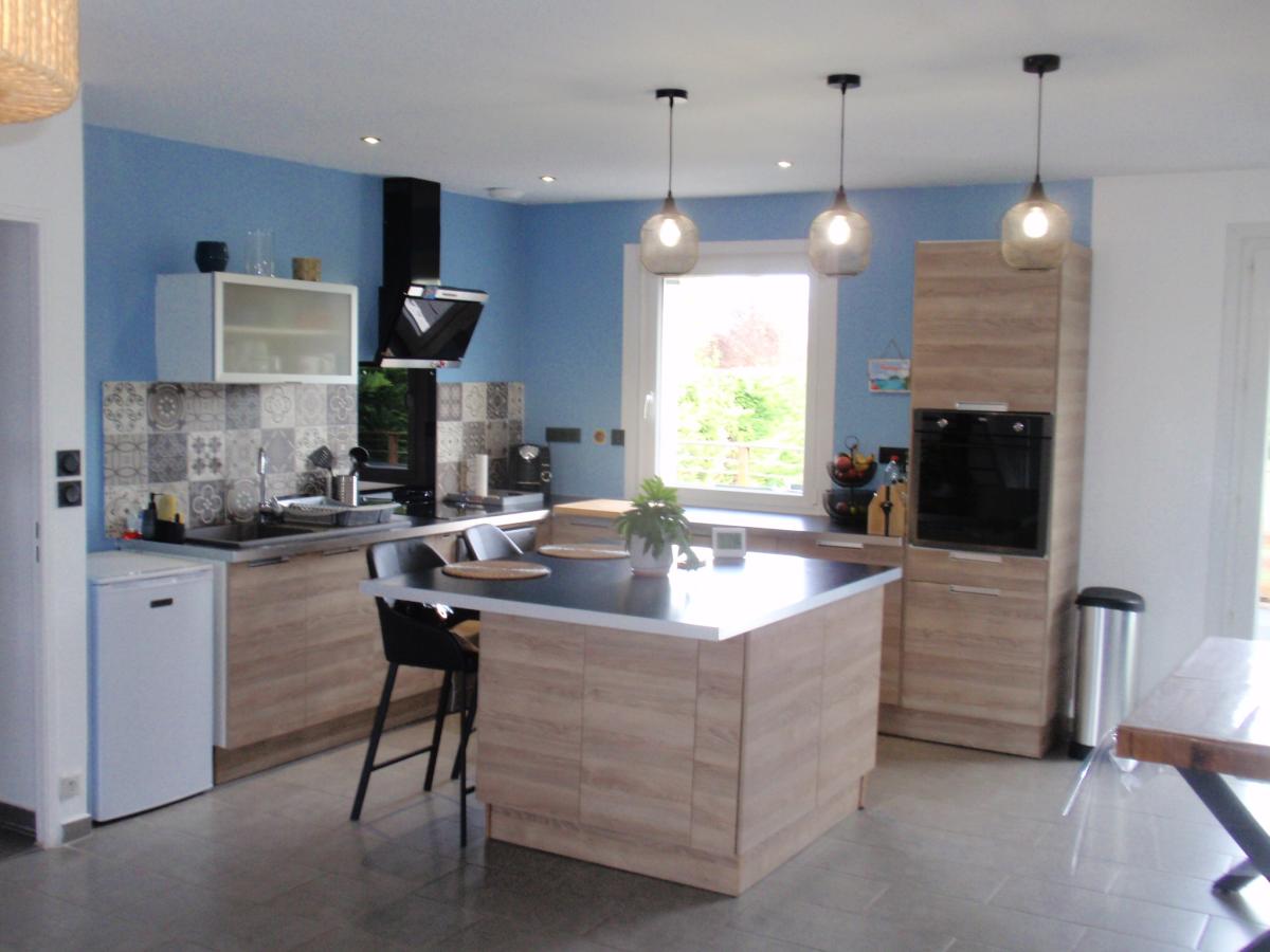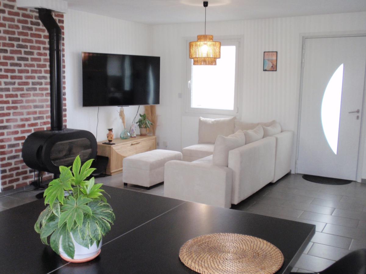 séjour salon avec poêle à bois ouvert sur une cuisine équipée avec îlot central, salle de bains avec baignoire et douche, 1 chambre + 1 chambre aménagée en dressing, laverie, wc.