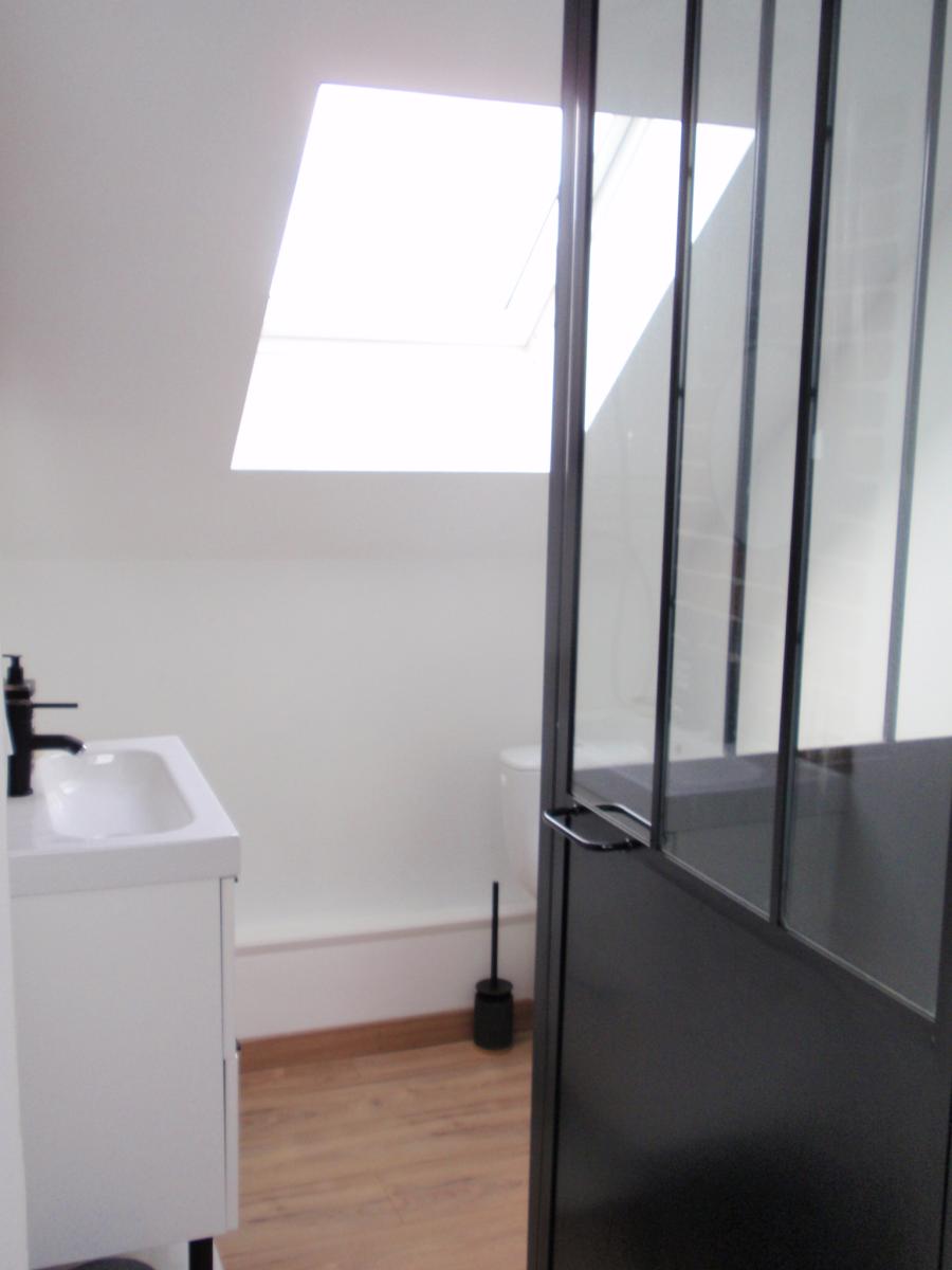 Etage : palier desservant : 2 chambres + salle de douche avec petit meuble vasque.