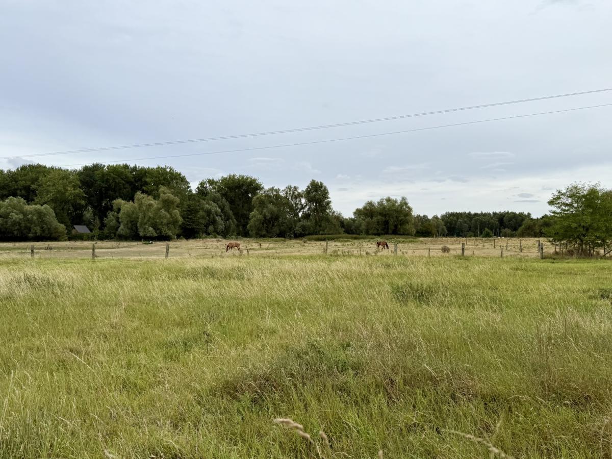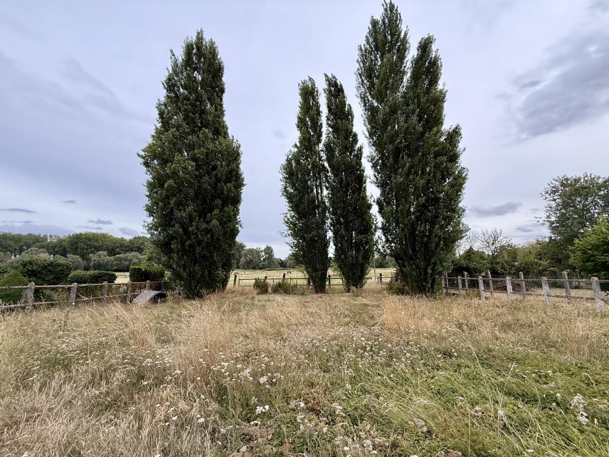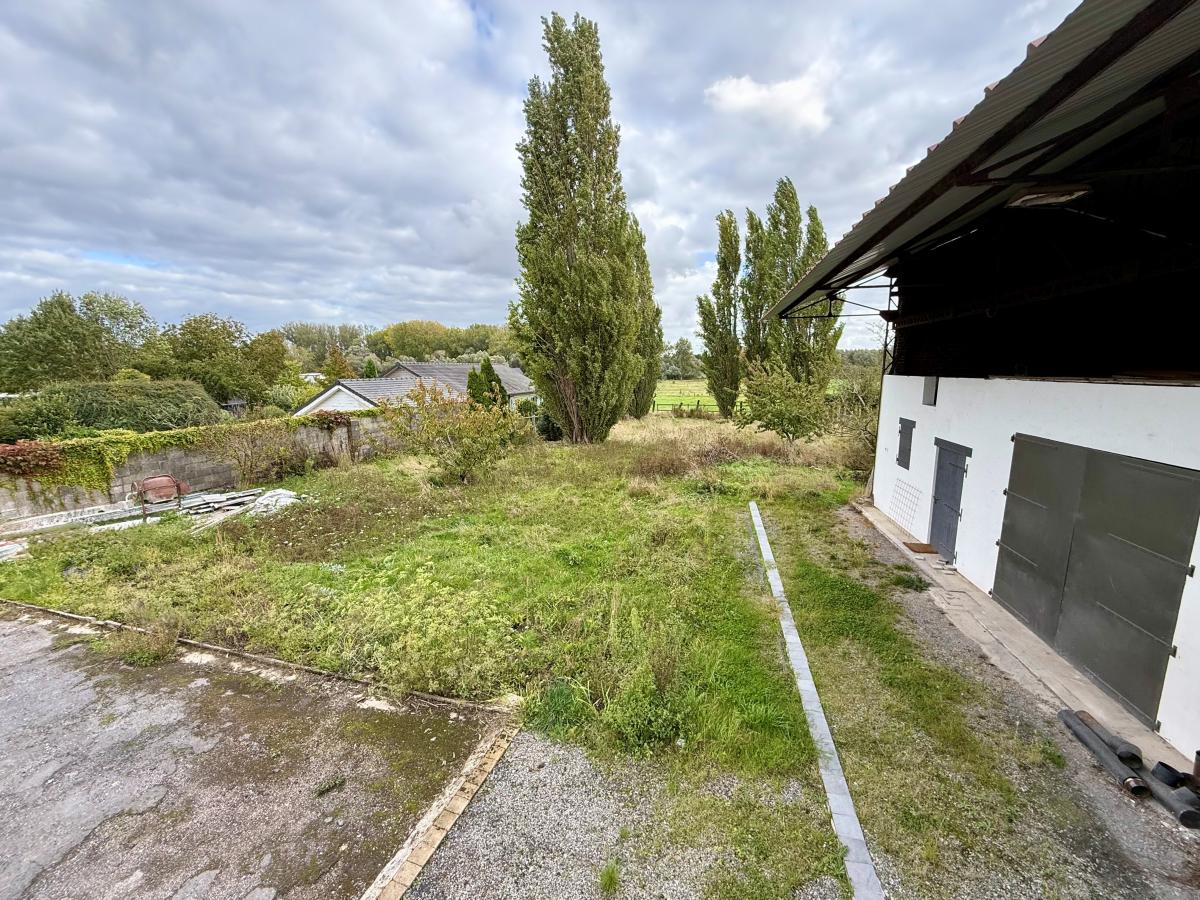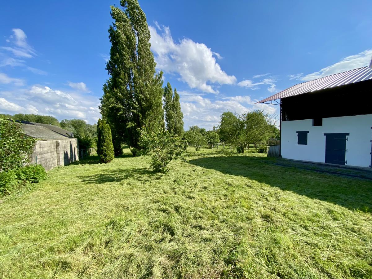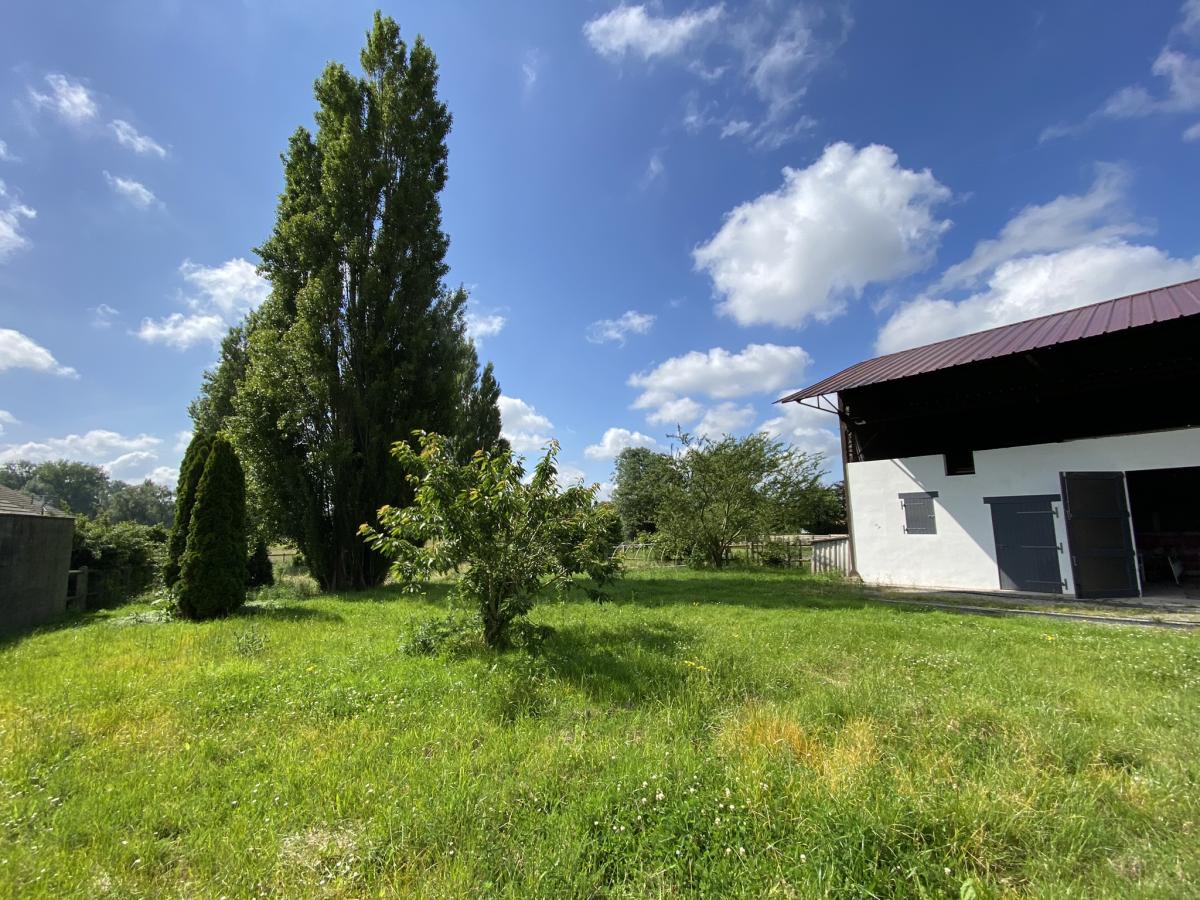 Vue dégagée plein Sud donnant sur prairie de pâturage- jardin arboré ( fruitiers + peupliers ) - grande surface de stockage avec le hangar.