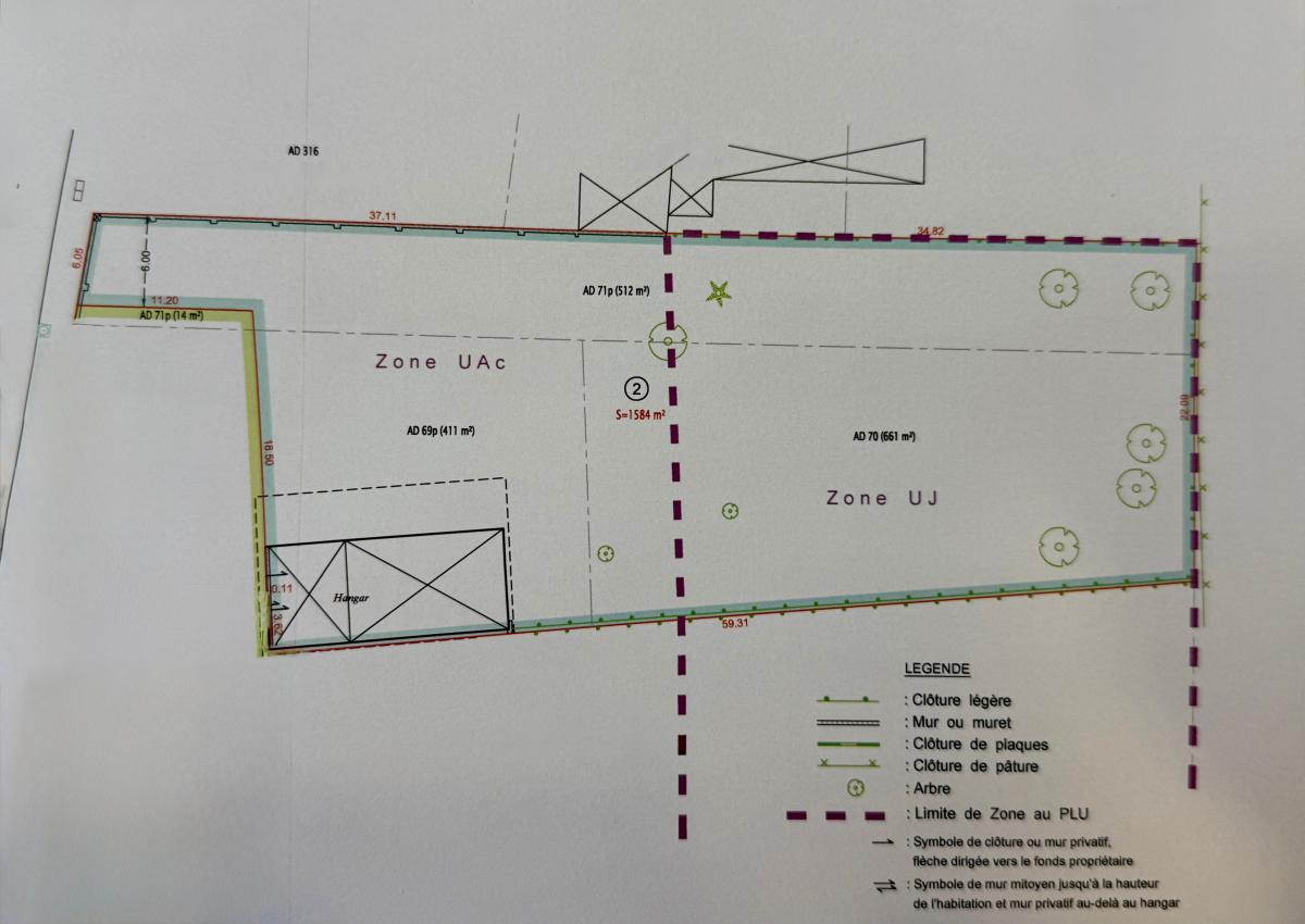 En détail : la moitié du terrain est constructible ( Zone Uac ), l'autre moitié peut supporter des constructions légères uniquement ( zone UJ) - Voir plan en photo.