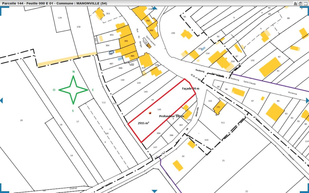 MANONVILLE, - Exclusivité - à 15 mn de TOUL, 20 mn de PONT-A-MOUSSON, au cœur du village et dans un environnement champêtre calme, belle parcelle de terrain à bâtir de 2915 m² libre de constructeur, zone UB du PLU avec réseaux en limite de propriété, façade de 24 mètres linéaires et 100 mètres de profondeur, exposition traversante N/E et S/O sans déclivité. Infos et contact : PAR TELEPHONE. Réseau Immobilier Notaires.