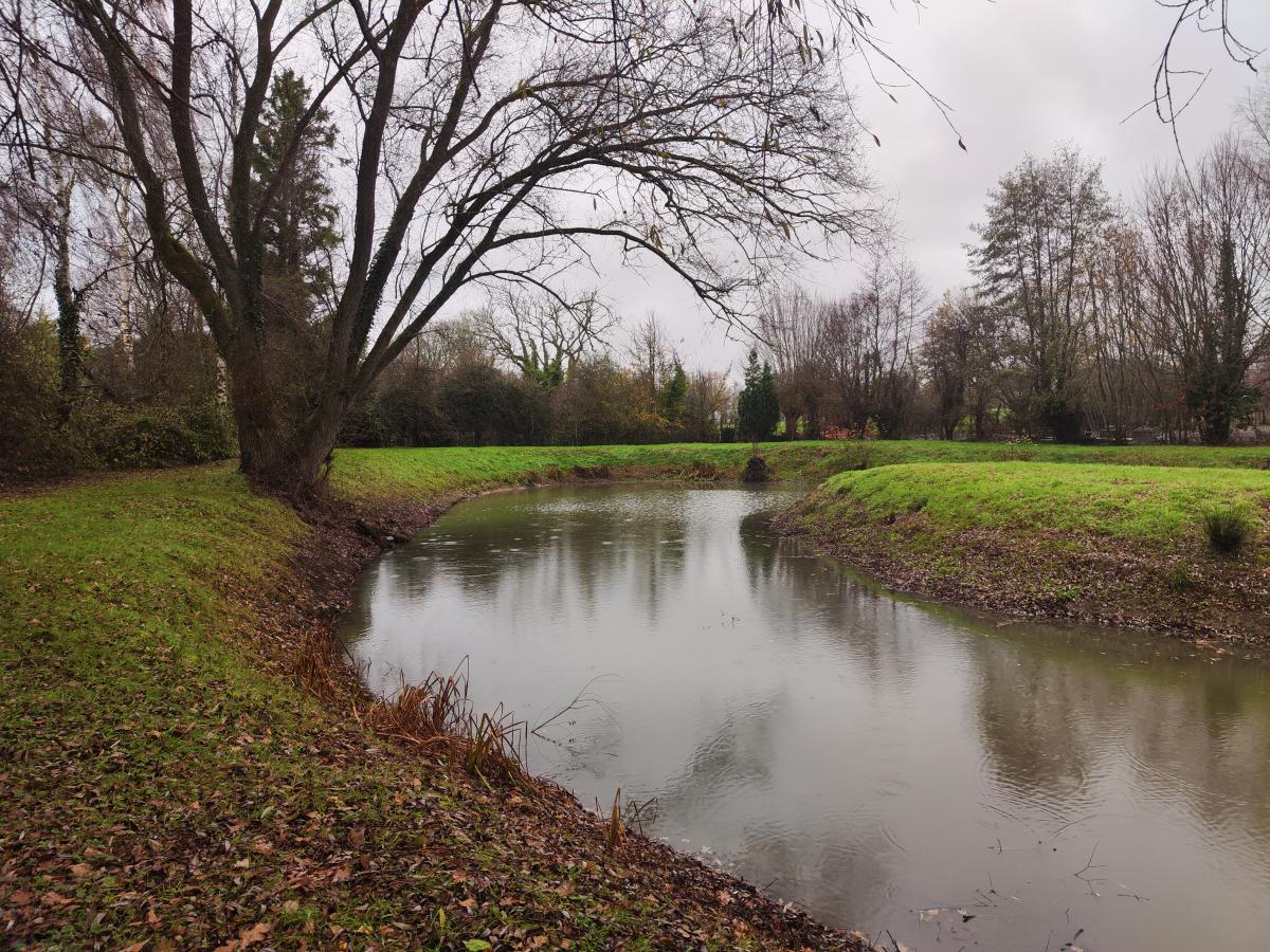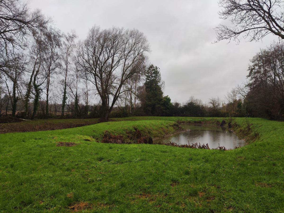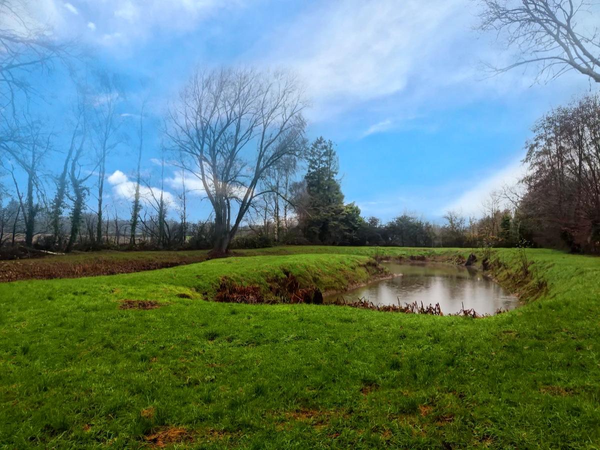 Etang en forme de U bien entretenu avec des rives dégagées avec abri et barque.