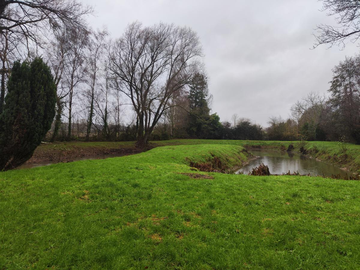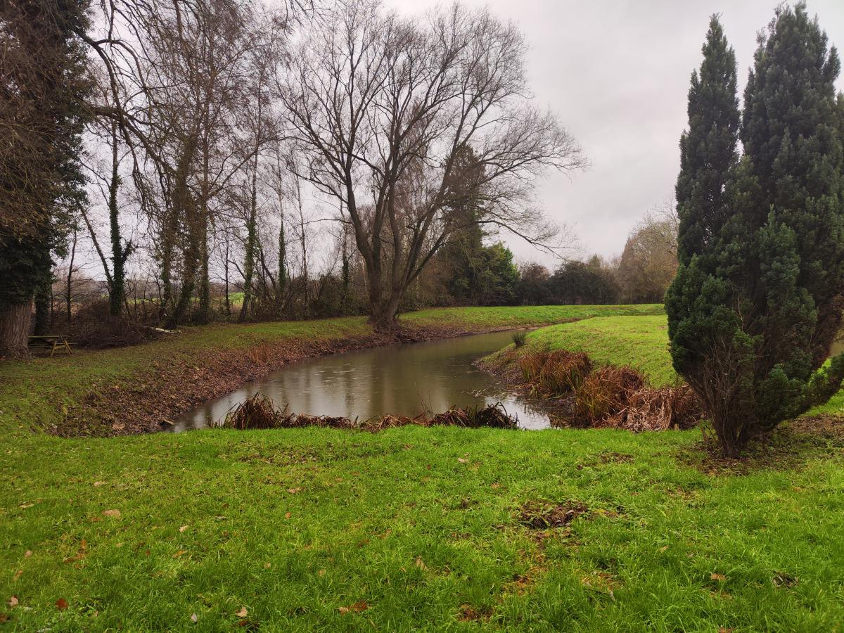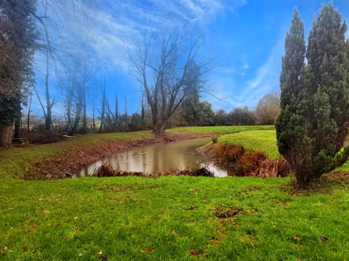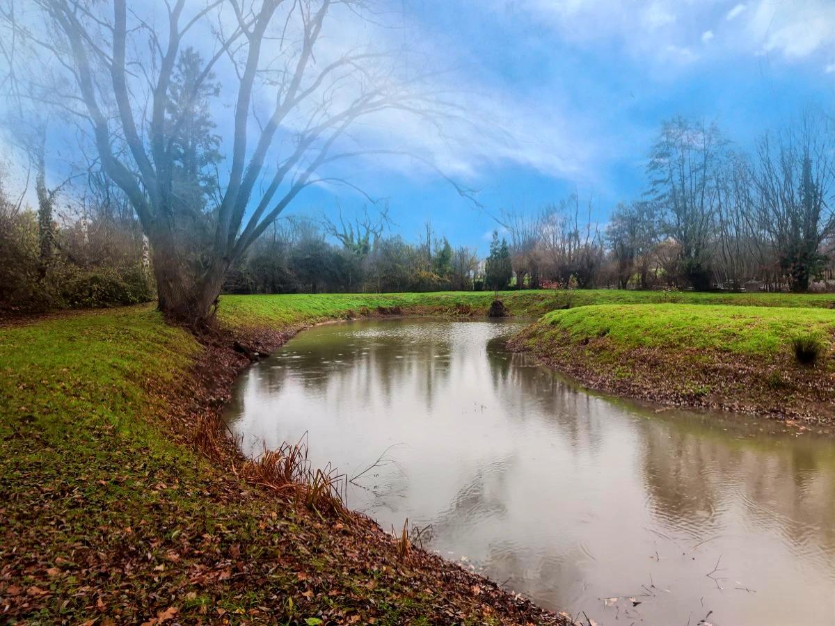 Etang en forme de U bien entretenu avec des rives dégagées avec abri et barque.