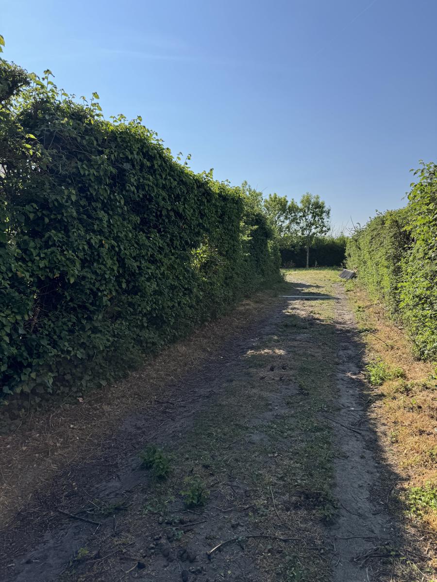 Accessible par un chemin privé, terrain à bâtir en retrait de rue d'une surface de 659 m² arboré et en partie clôturé.