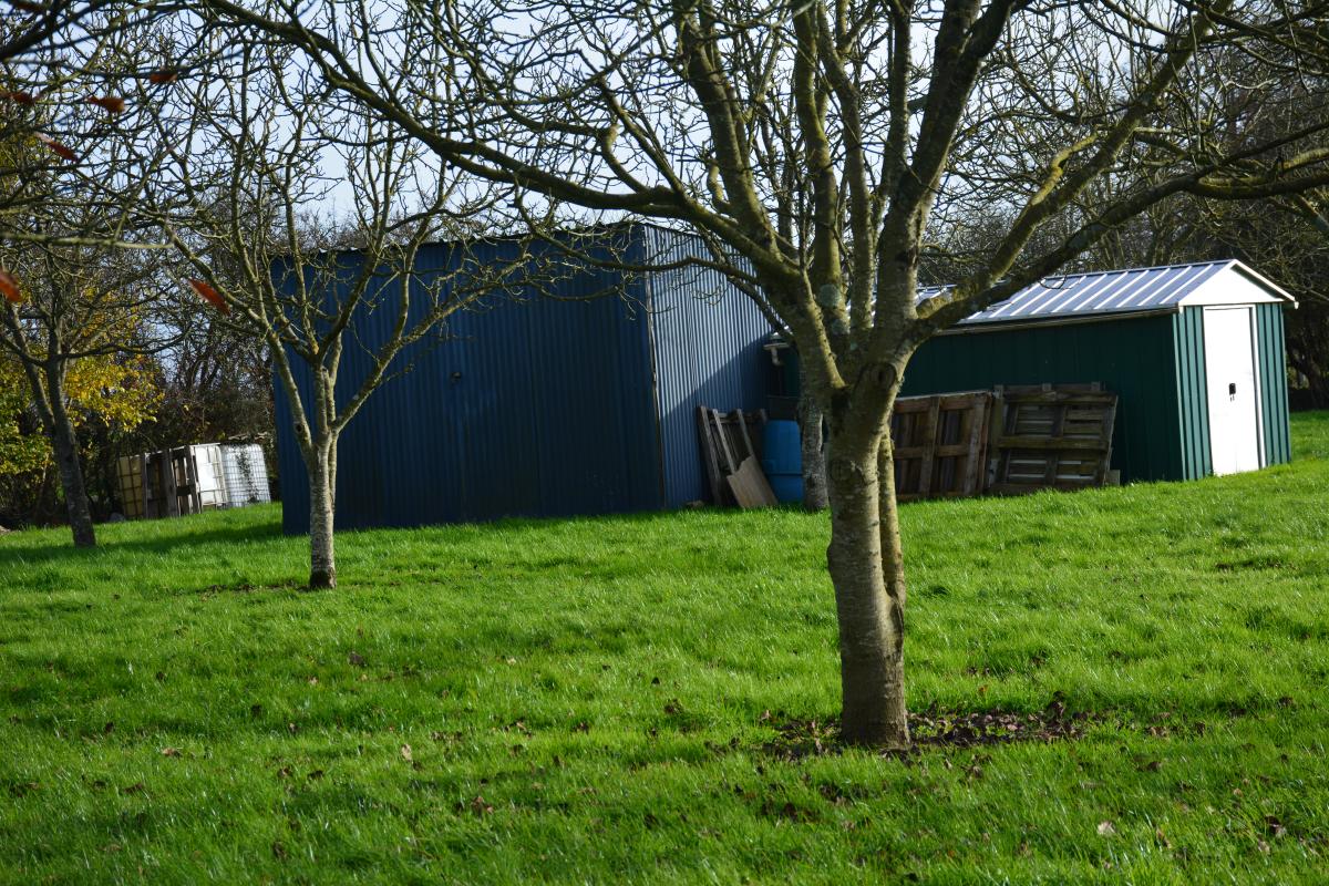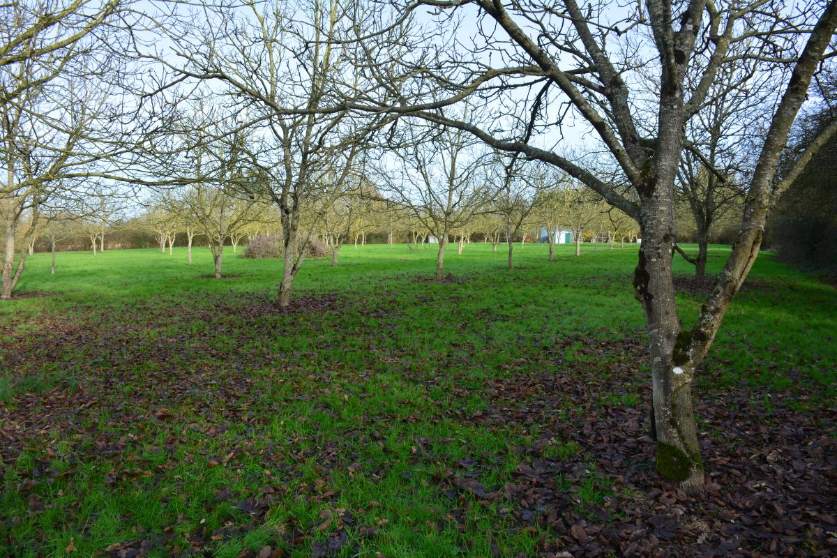 terrain arboré avec des arbres fruitiers, principalement des noyers, abri de jardin sans eau ni électricité
