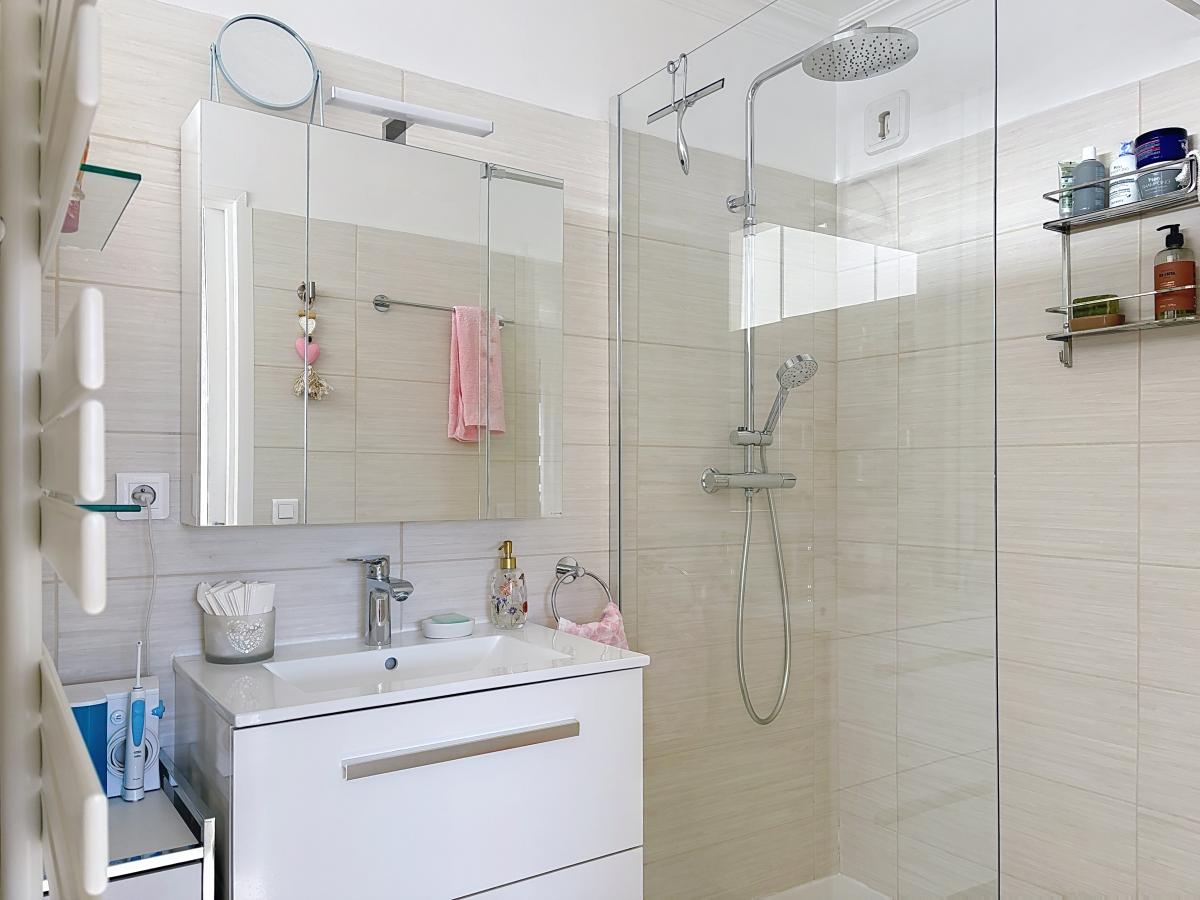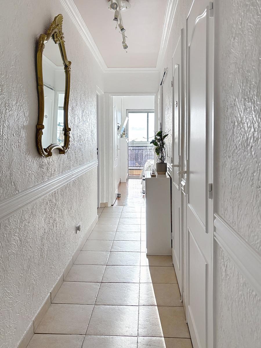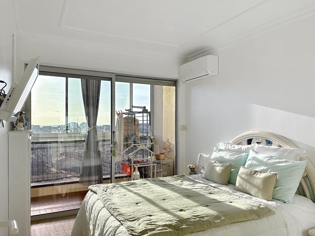 L'appartement est composé d'un hall d'entrée avec de grands placards , donnant sur un double séjour de 30 m² très lumineux ouvrant sur un balcon terrasse offrant une vue dégagée sur le Parc ,sans vis à vis , exposé est et un aperçu mer.