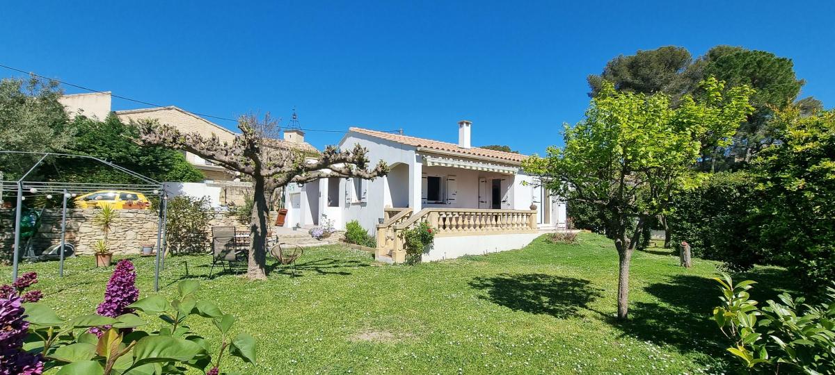 Villa individuelle de plain-pied, (112 m² de surface totale), exposée Sud-Est et érigée sur une parcelle arborée de 1003 m² piscinable avec garage...