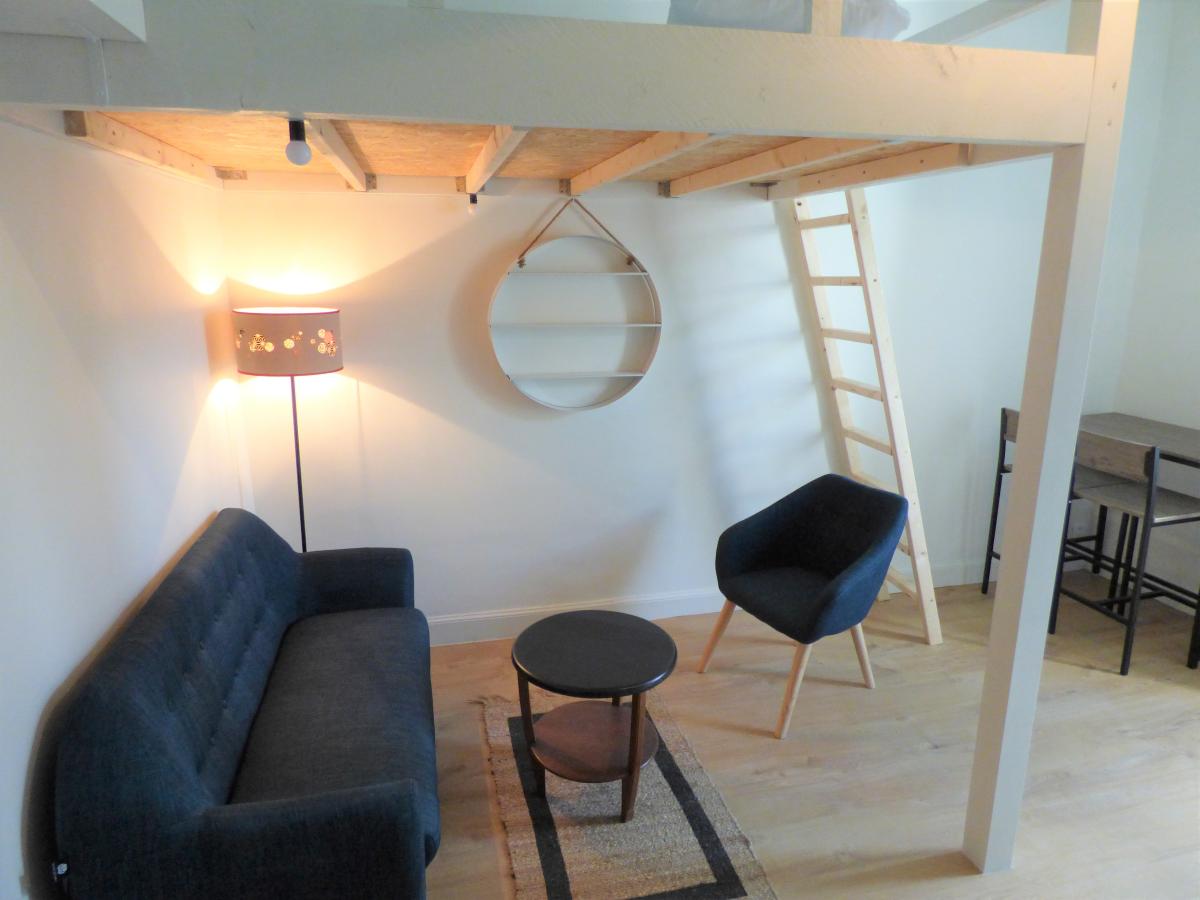 Angers/ Gare, parfait état pour ce studio meublé loué , il comprend une pièce principale joliment aménagé, un espace cuisine , un lit en mezzanine...