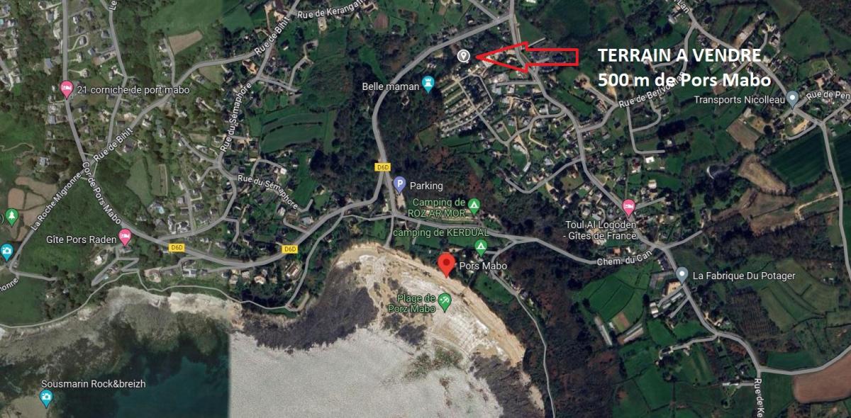 Située à 500 m de la plage de Pors Mabo. Grande parcelle de terrain de 2 536 m² située en zone UC du PLU de la commune.