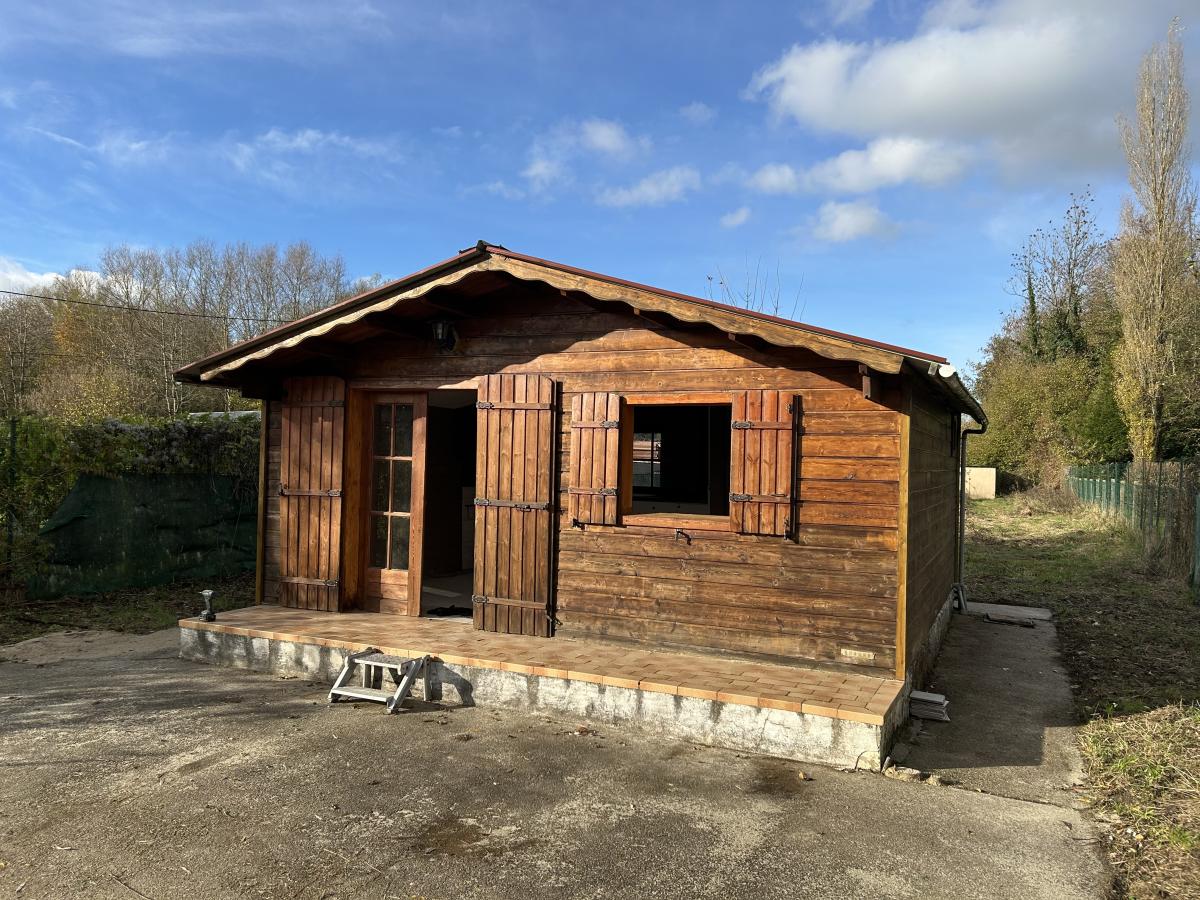 Chalet en bois sur dalle béton, de 25m², sans système de chauffage, mais disposant d'une cuisine en kit, du tout à l’égout, d'une cabine...
