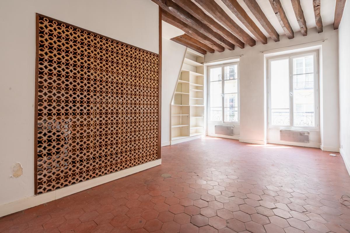 Dans l’une des rues les plus prisées du Marais, à proximité du Musée Carnavalet et de la place des Vosges cet appartement traversant, baigné de lum...