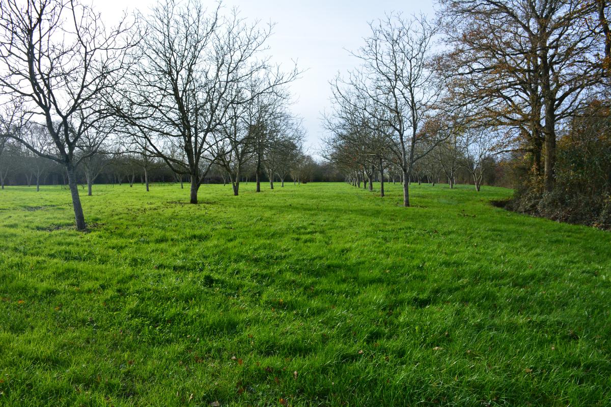 terrain arboré avec des arbres fruitiers, principalement des noyers, abri de jardin sans eau ni électricité