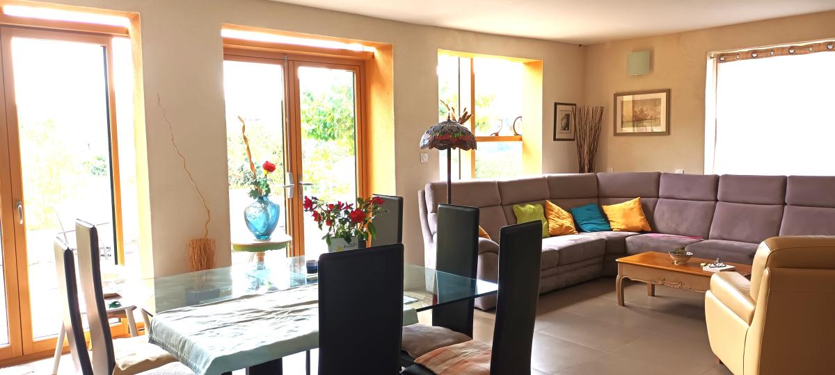 L'entrée se fait dans un salon avec un insert au bois, dans le prolongement, une salle à manger, une cuisine éq...