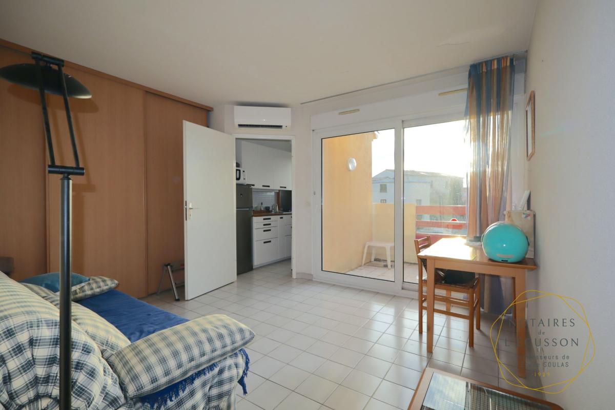 Séjour avec petite cuisine ouverte, une chambre, salle d'eau, wc
