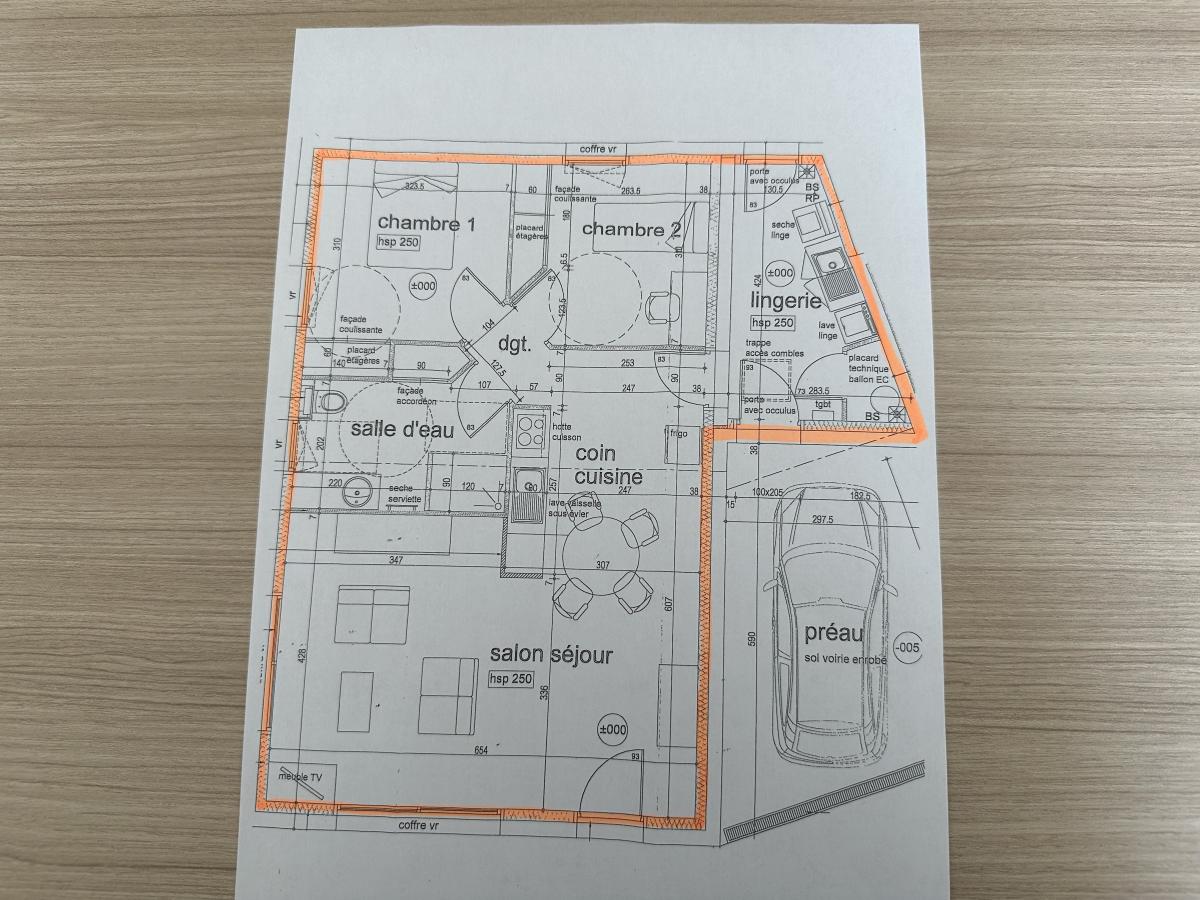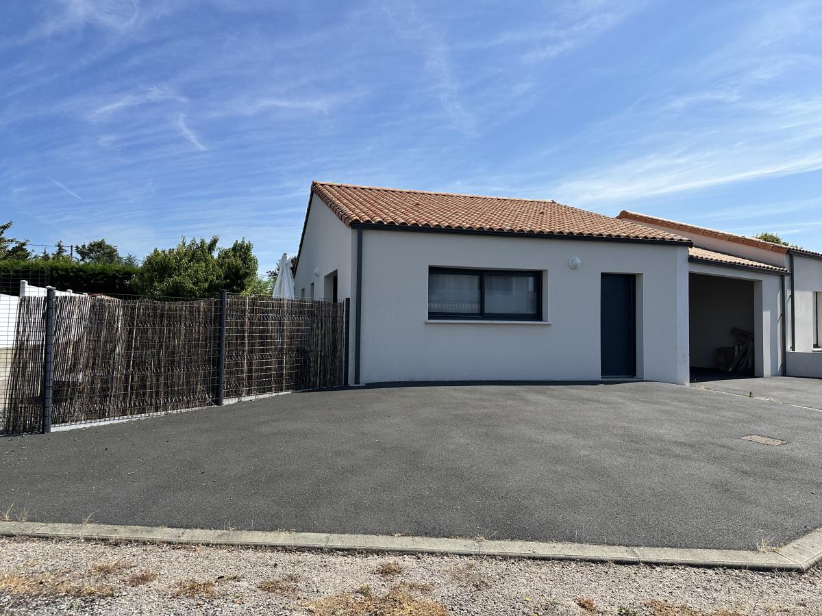 Montaigu Vendée - Quartier Planty - Une maison de plain-pied comprenant : salon, cuisine ouverte aménagée et équipée, deux chambres, salle d'eau avec toilettes, dégagement - en annexe : lingerie - Préau - Jardin - a savoir : Année de construction 2018 - Surface habitable 72,75 m² - Chauffage Pompe à chaleur Géothermique Plancher Chauffant