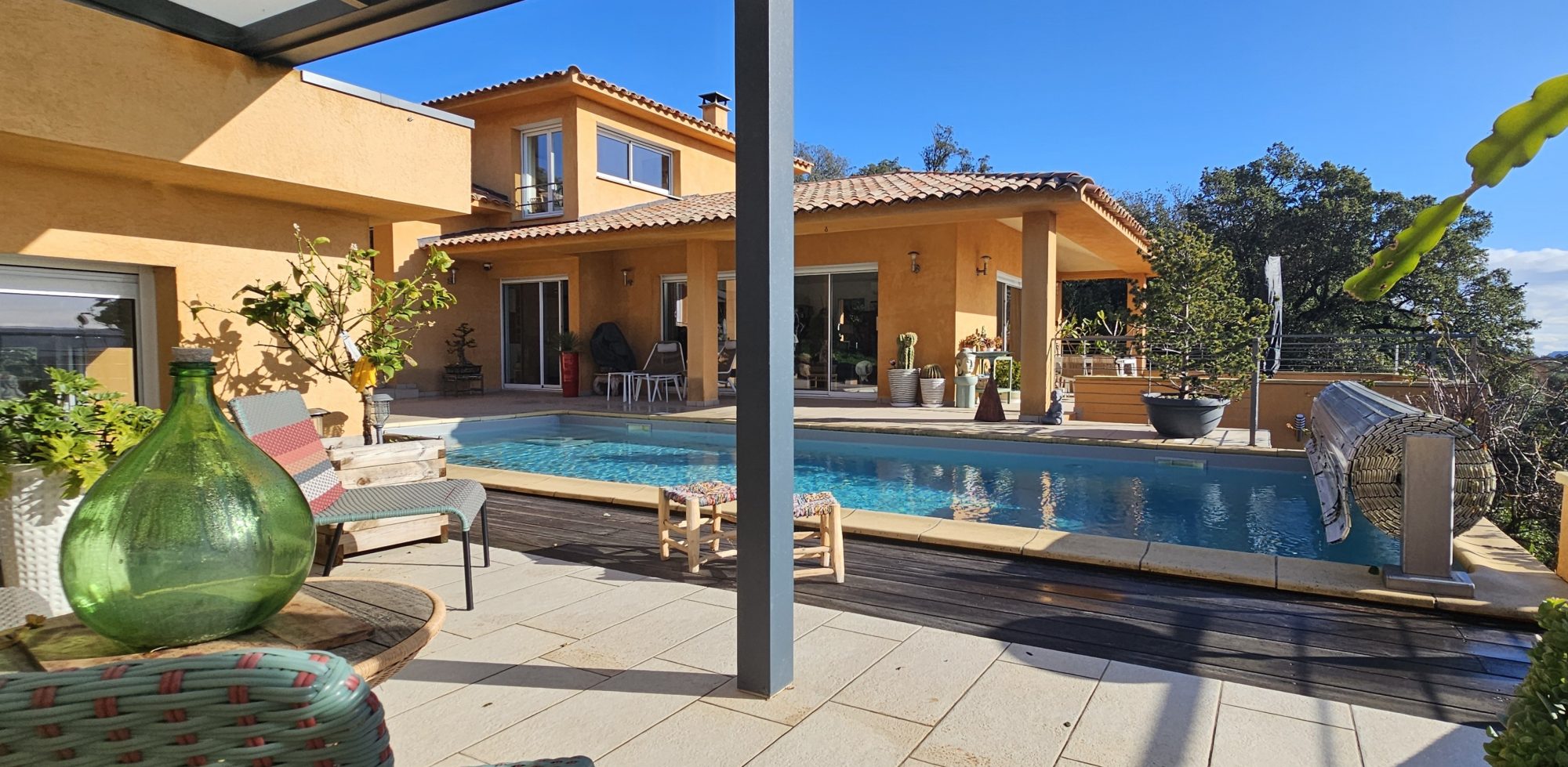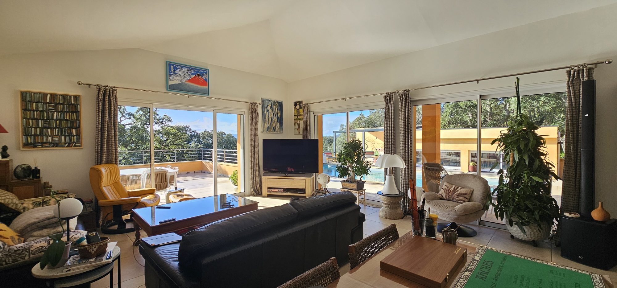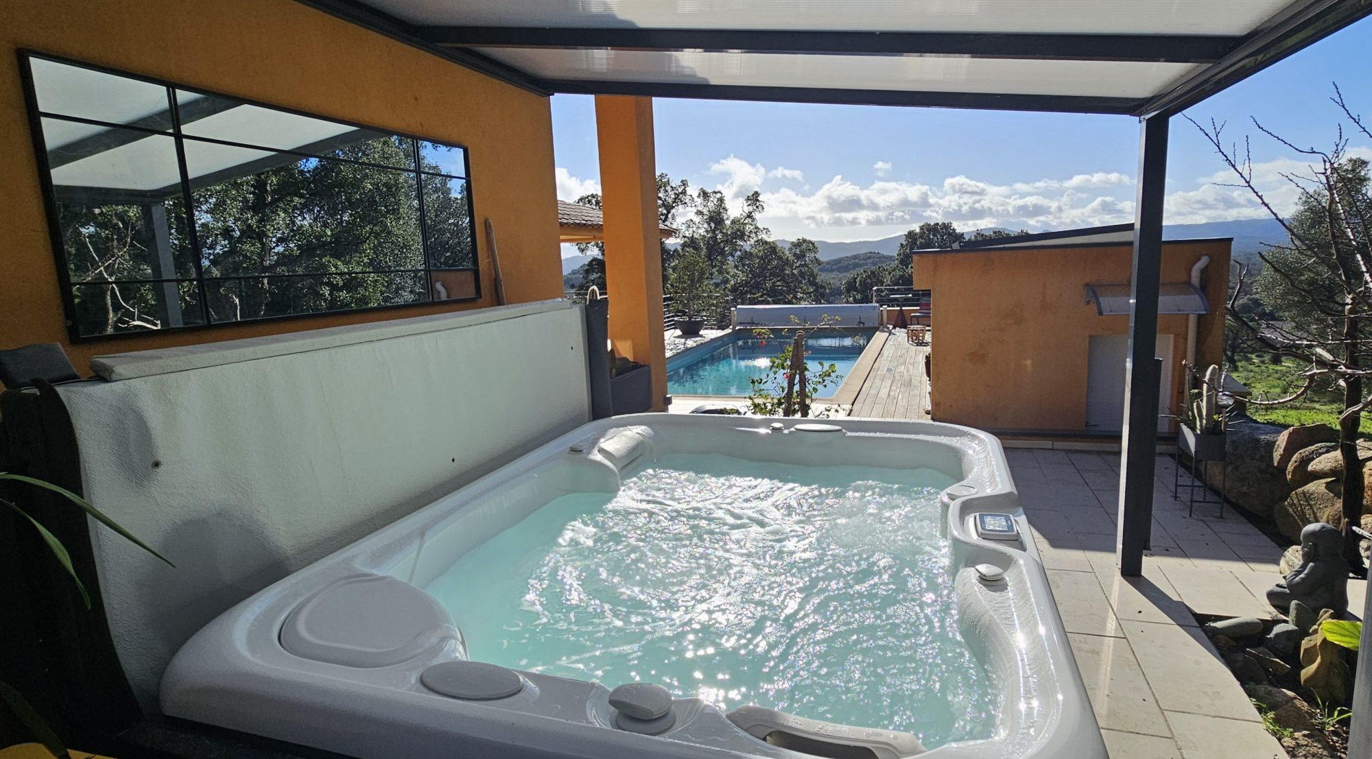 À l’extérieur, la piscine au sel (11 x 4 m) s’intègre naturellement au jardin, tandis que le jacuzzi offre un espace de détente complémentaire. De plus un abri permet de stationner vélos et scooter en toute praticité.